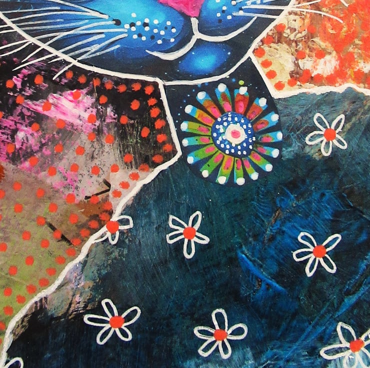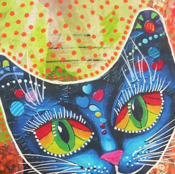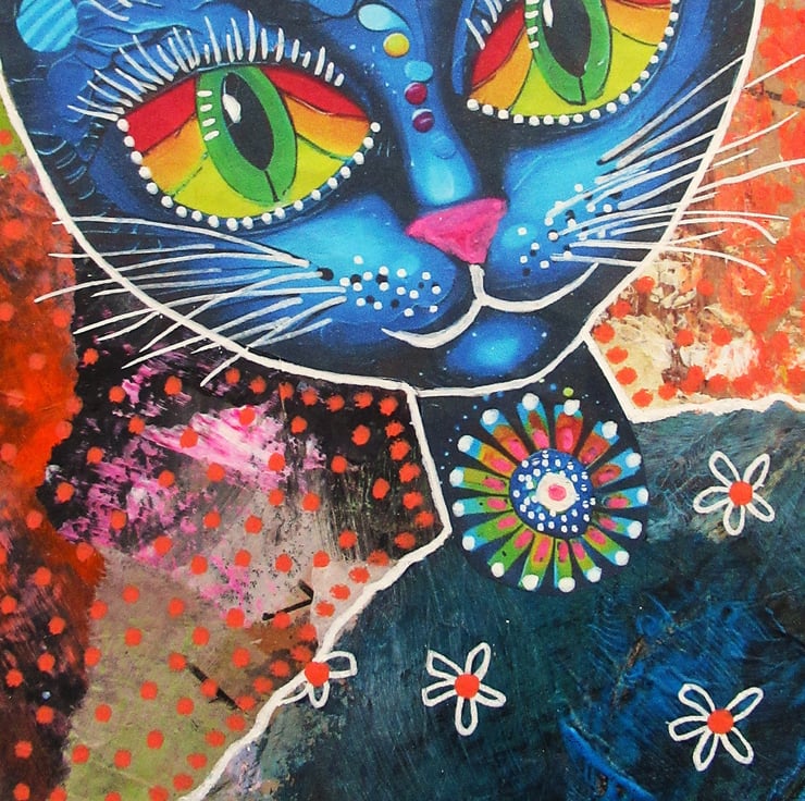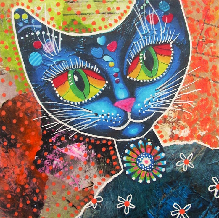 Small format artwork bringing playful energy to your space. Featuring a whimsical blue kitty with massive rainbow coloured eyes. In acrylic, collage and drawing pens on cardboard measuring 5 x 7 inches - this is a vibrant OOAK piece of artwork which is perfect for cat lovers, modern art enthusiasts, and anyone looking to add a pop of color to their interior space. This would also make a perfect gift for birthdays, housewarmings, or as a statement piece for your gallery wall. Slip straight into any standard sized frame (or mount). Your artwork will be signed on the front by Bea before dispatch.