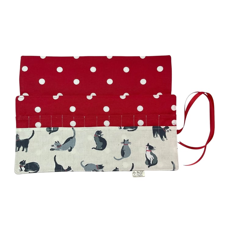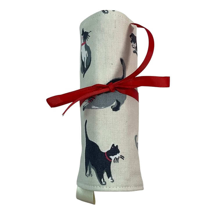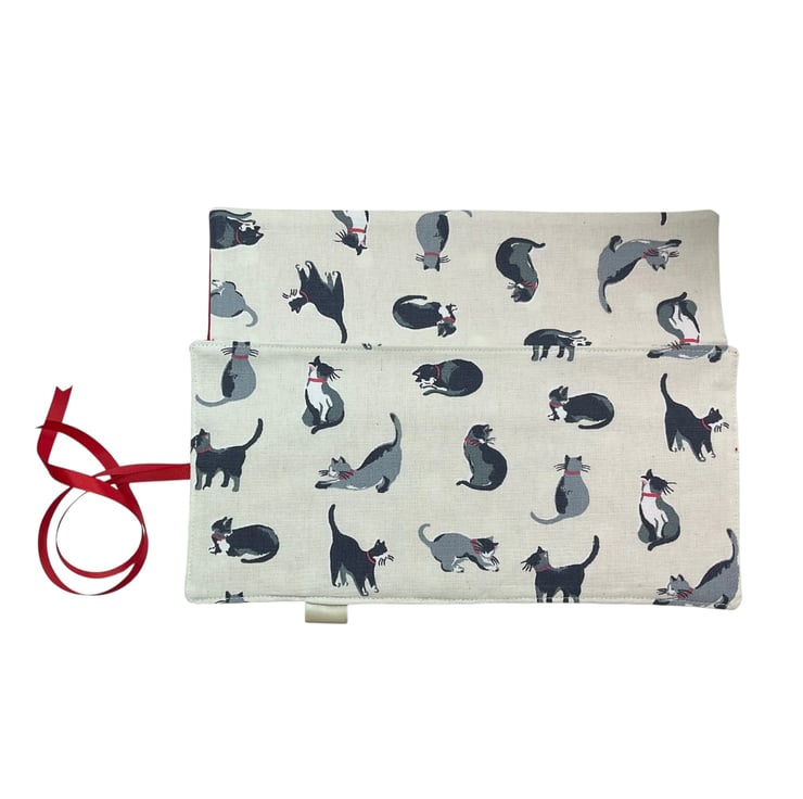 This lovely heavier weight duck canvas, with black cats with red collars patterned fabric is the centrepiece of this crochet hook case, set on a natural background. I have carefully paired it with a bright red with white spot heavier weight canvas for the lining, underside of the flap and upper needle pocket.