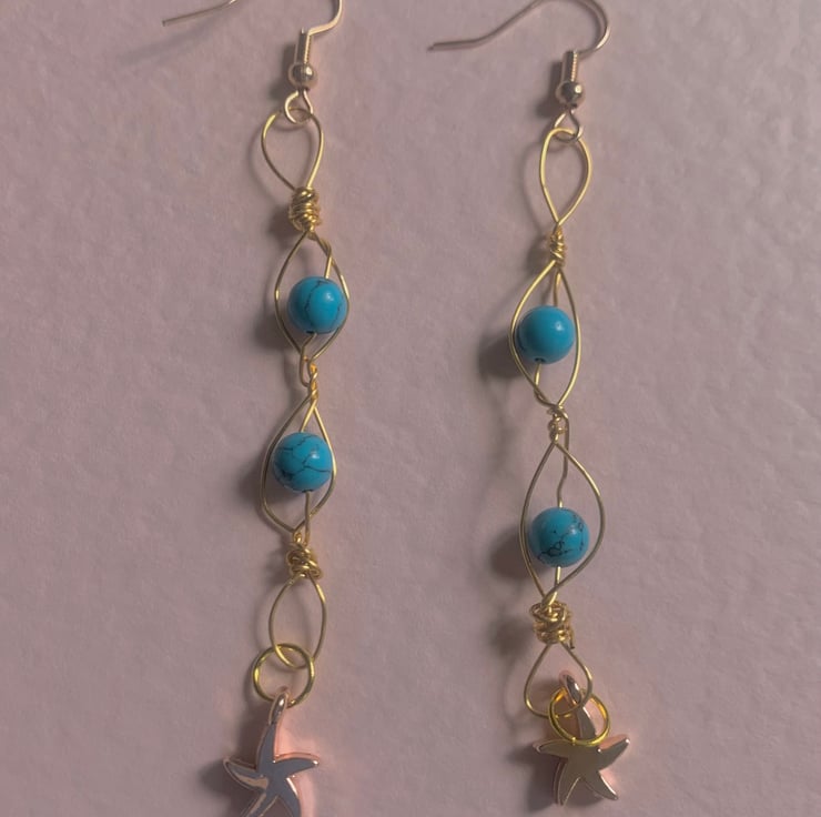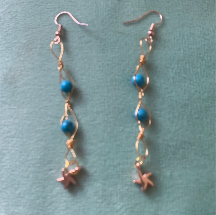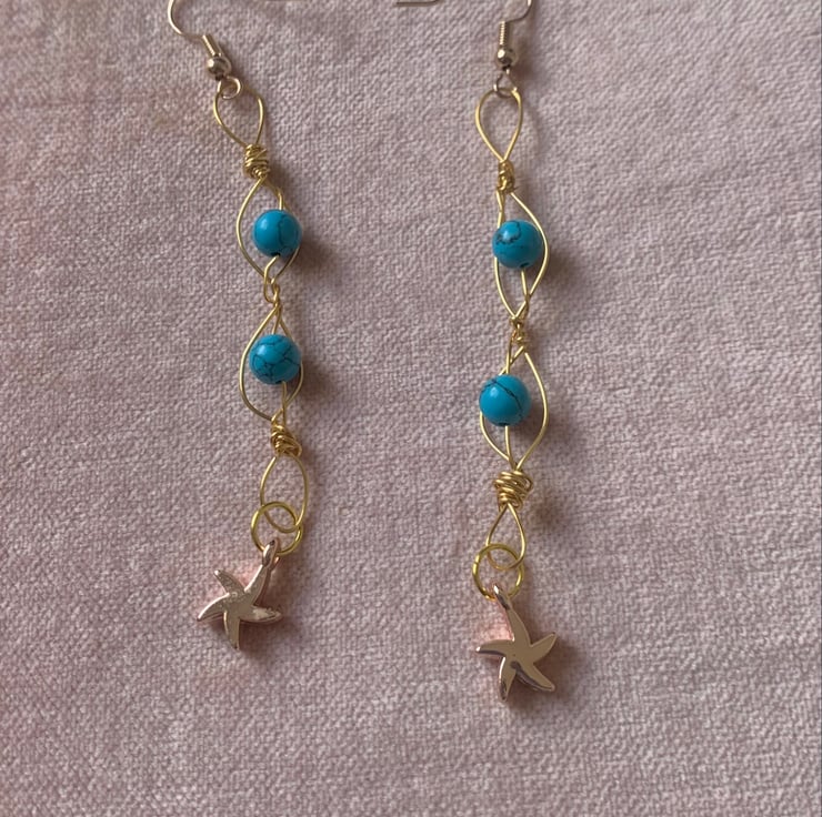 Beautiful turquoise agate and gold and rose gold earrings with pretty starfish charm. They measure 70 mm in length and have hypo allergenic ear hooks. 6 mm beads wrapped in quality gold and rose gold wire.