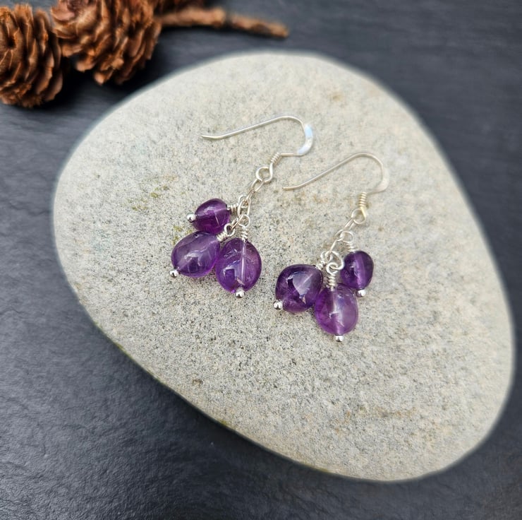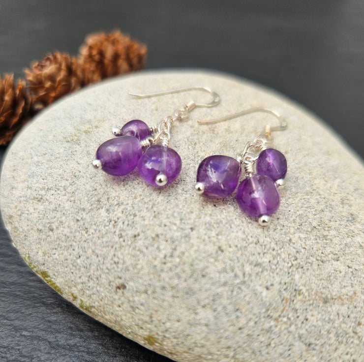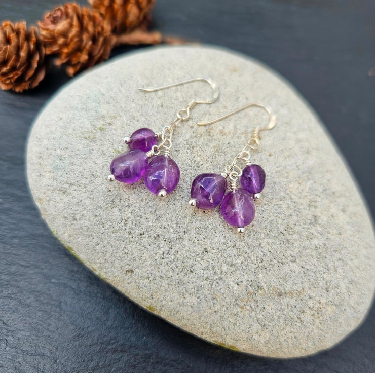 These one-of-a-kind earrings are made with amethyst nugget beads which are carefully attached to a sterling silver chain to create a beautiful cluster of gemstones. All the metal components used to create these earrings are sterling silver. Rubber earrings backs are also provided which can be used to help secure the earrings when being worn.