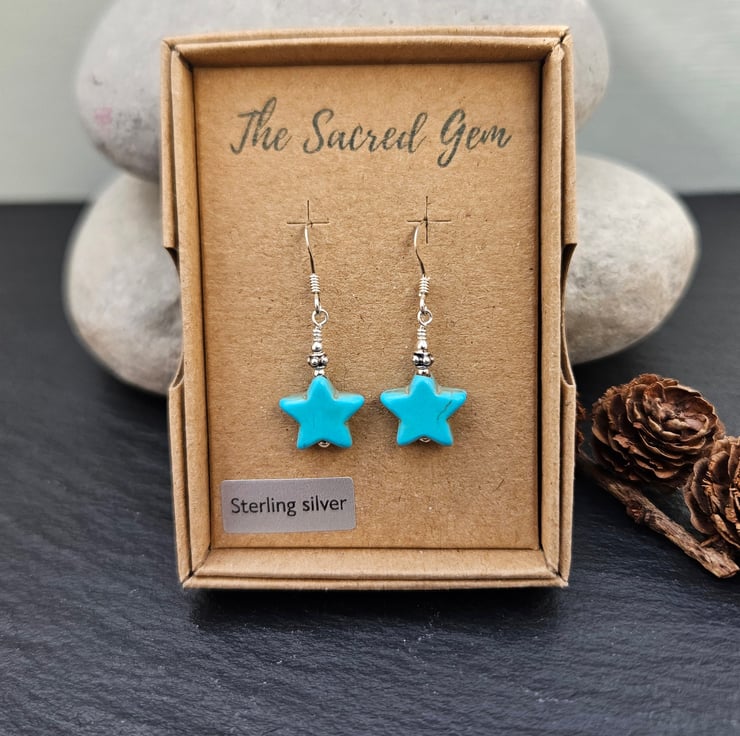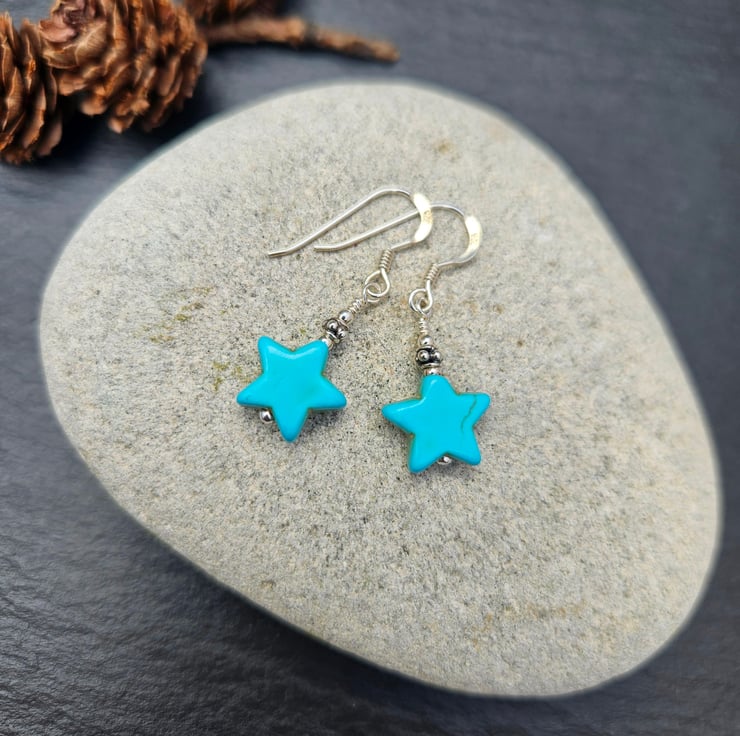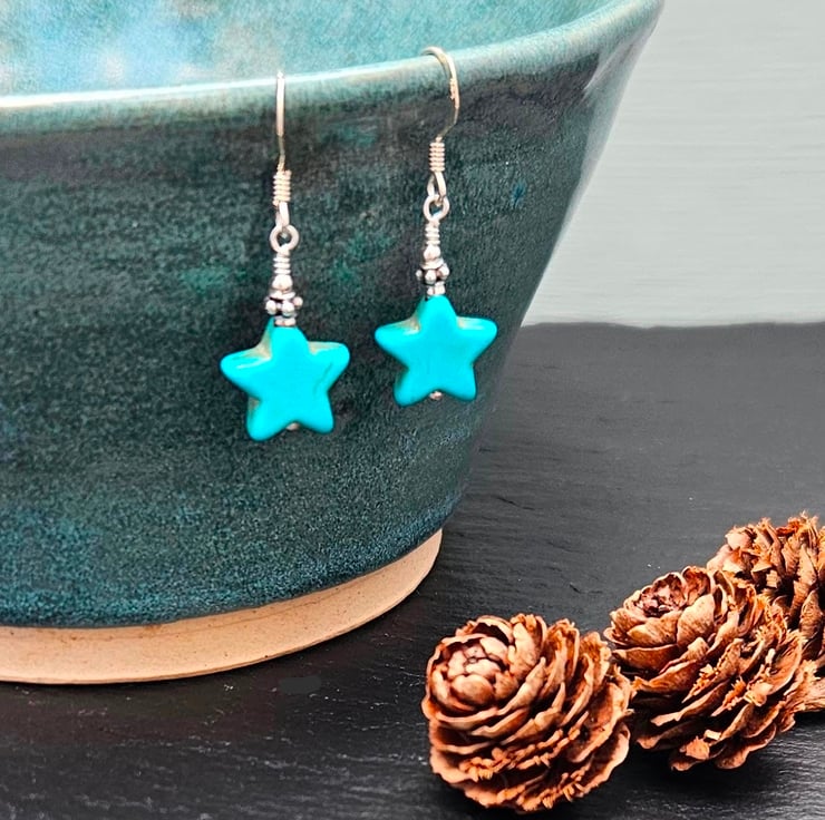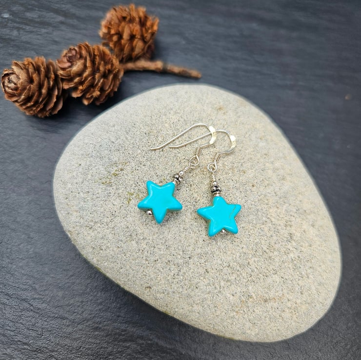 These pretty earrings are made with star-shaped howlite gemstone beads in a vibrant turquoise shade. They also feature a beautiful, decorative Bali silver bead. All the metal components used to create these earrings are sterling silver. Rubber earrings backs are also provided which can be used to help secure the earrings when being worn.