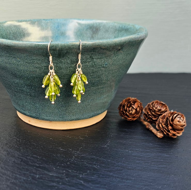 These pretty earrings are made with a group of 9 small peridot nugget beads on each earring, which are carefully attached to create a beautiful cluster of gemstones. All the metal components used to create these earrings are sterling silver. Rubber earrings backs are also provided which can be used to help secure the earrings when being worn.