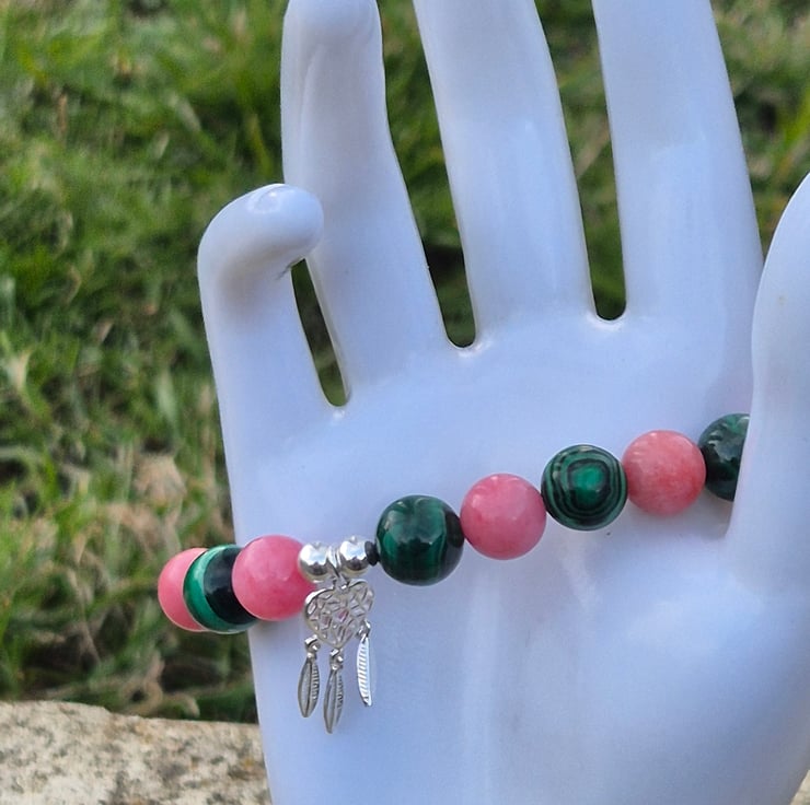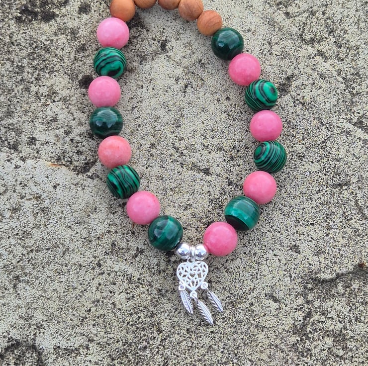 Awaken your heart and spirit with this handcrafted bracelet featuring Malachite, Rhodonite, warm wooden beads, and a Sterling Silver dream catcher charm. Malachite empowers transformation and shields your energy as you grow. Rhodonite nurtures emotional healing and opens the heart to compassion. Wooden beads ground your spirit, connecting you to nature’s rhythm. The dream catcher charm adds a sacred touch—symbolizing protection, intuition, and the filtering of energies to invite clarity and truth.