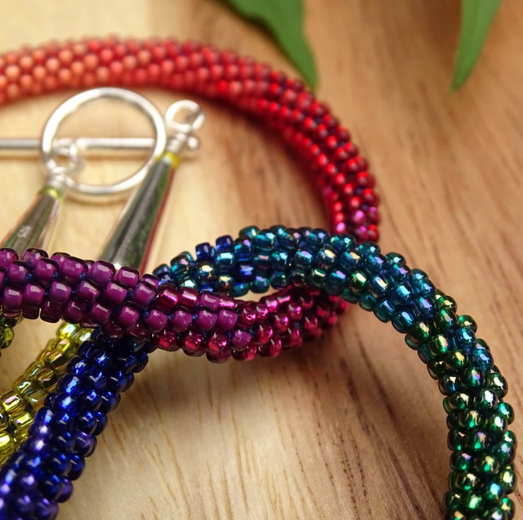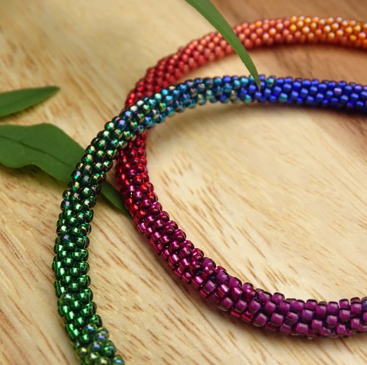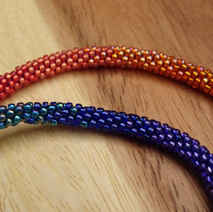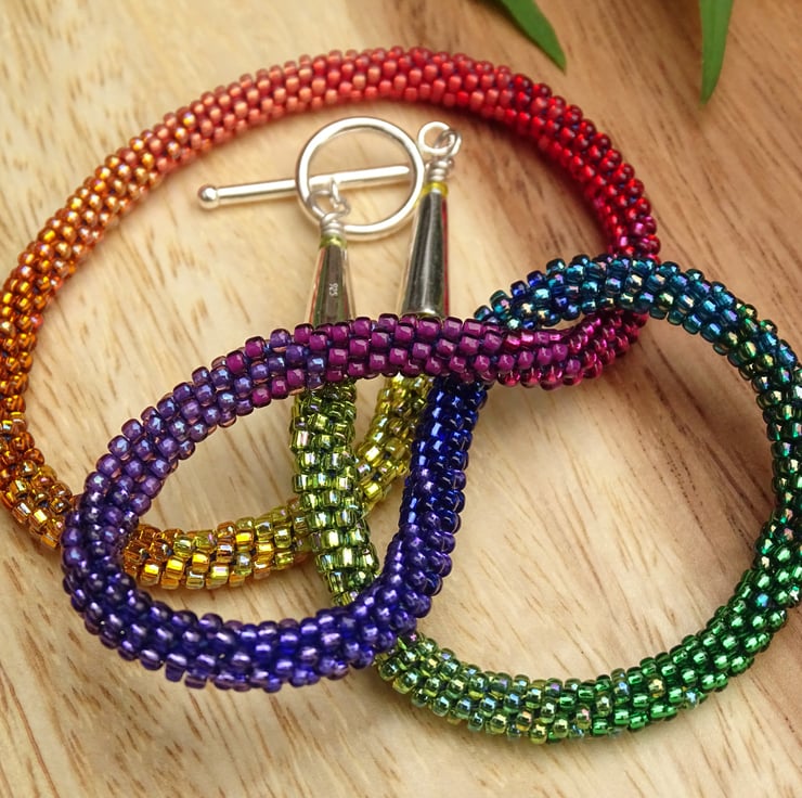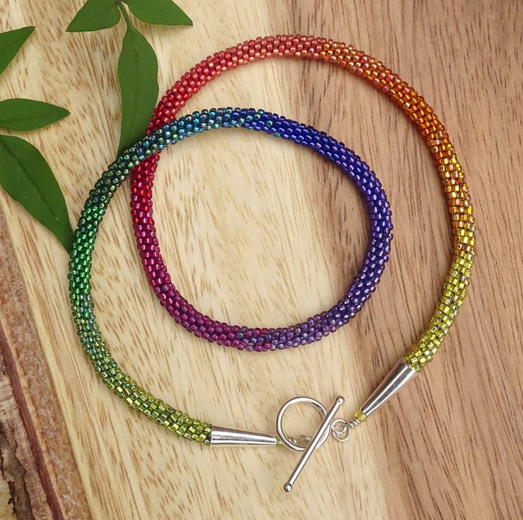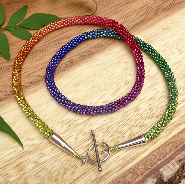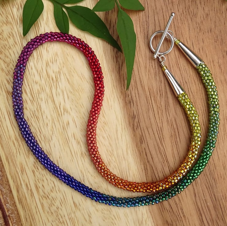 A stunning perfect rainbow, this is an ombré rainbow beaded necklace made using the kumihimo weaving technique and nylon thread, so it's super strong and can be worn all day. It's made with seventeen colours of high quality glass beads blending beautifully from green to blue, purple, red, orange and yellow. The endcaps and toggle fastening are sterling silver.