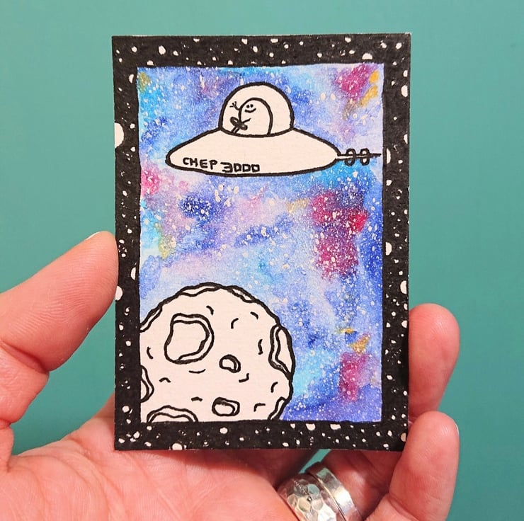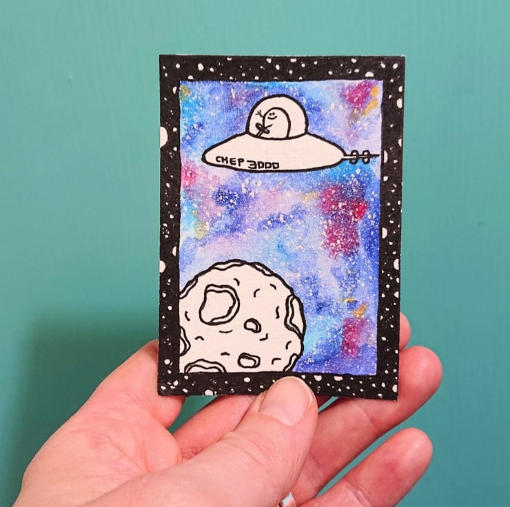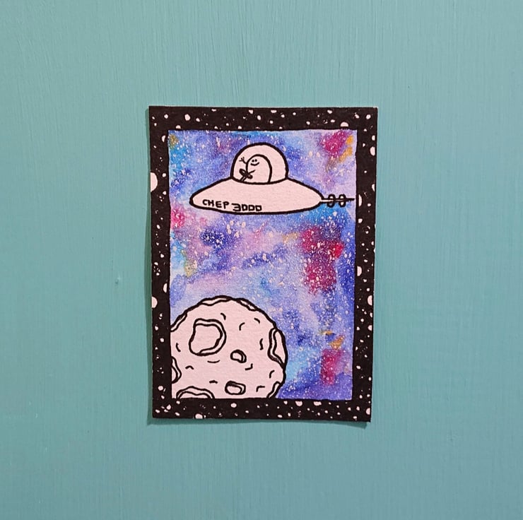 This piece features one of my cute Cheps zooming by in his spaceship, the Chep 3000! I will be adding and creating more ACEOs in the future to build a collection. I love using watercolours and I find creating space and galaxy paintings particularly fun :)