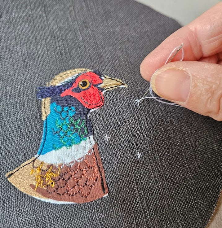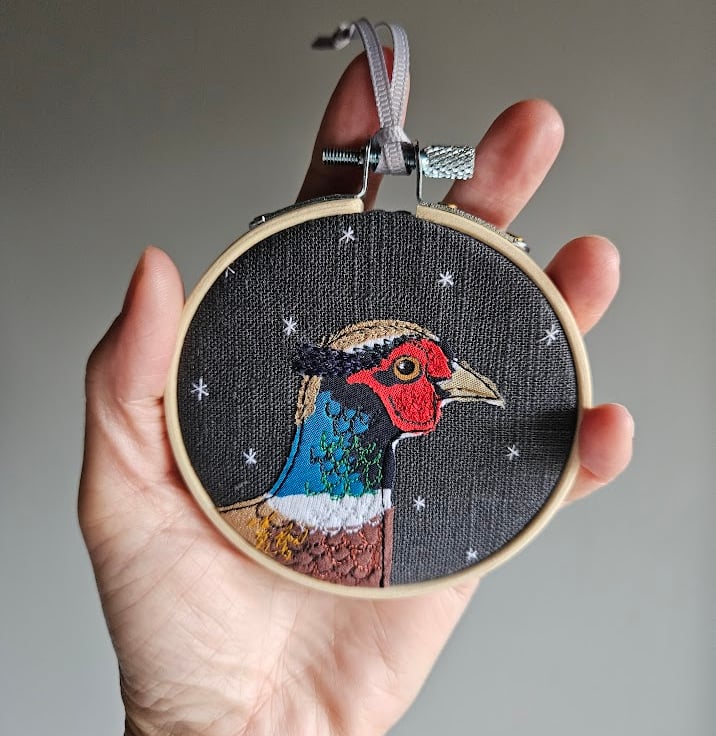 A beautiful handmade mini hoop featuring a fabric appliqué pheasant on dark grey linen, finished with free-motion embroidery and delicate white hand-stitched snowflakes/stars to evoke a snowy/night-time scene.