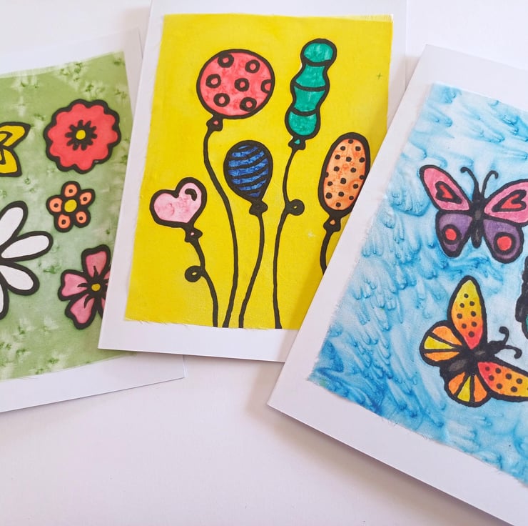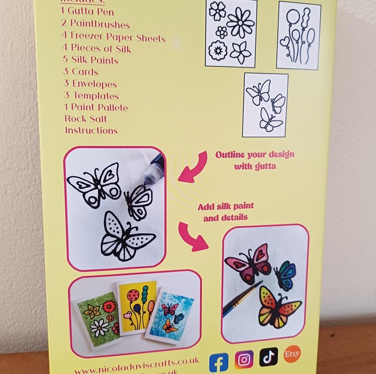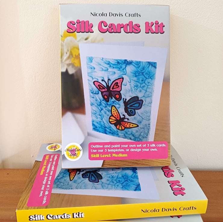 Each kit contains all the equipment you will need to make your own set of 3 silk cards (and practice on some silk first). Use our 3 templates, or design your own from scratch.