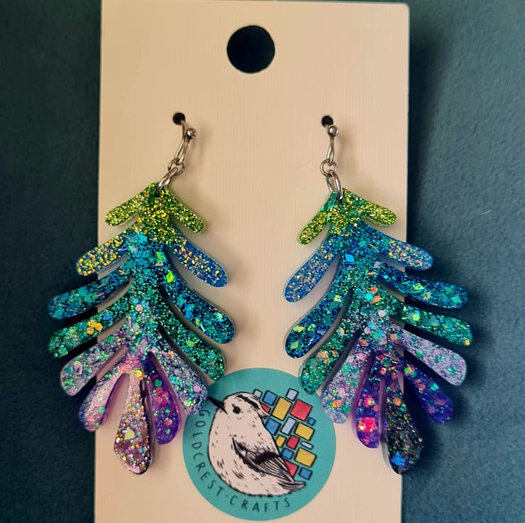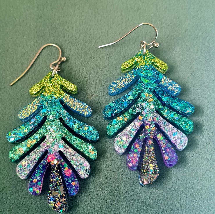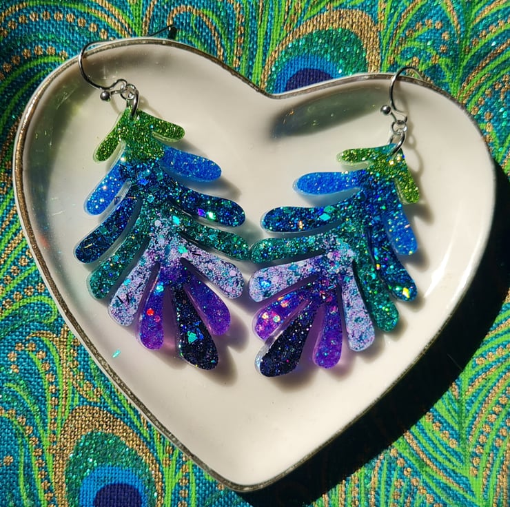 They are made from eco-glitter in gradiated tones of deep purples, bright lavender, lilac, teal, azure blue, sky blue and lime, set in bio-resin. They have hypoallergenic stainless steel French hooks and in total measure 60 x 30 x 4 mm. The resin is light and durable - perfect for earrings.