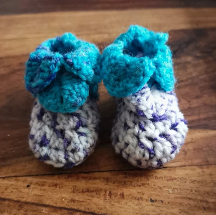 The layered, ruffled tops resemble petals, and the choice of vibrant blue and purple yarn enhances that floral look. Handmade items like this are often made as gifts for newborns, combining both practicality (keeping tiny feet warm) and a touch of decorative charm inspired by nature.