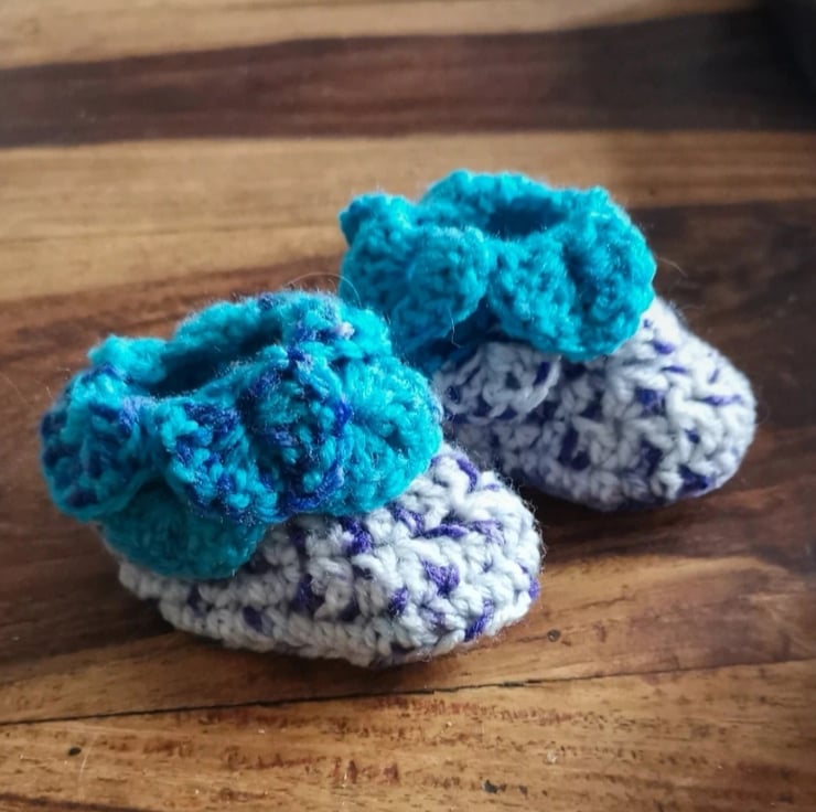 Adorable hand-crocheted baby booties, perfect for keeping little feet warm and cozy.