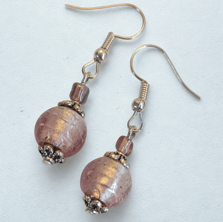 Shimmery pink recycled glass beads with tiny pink glass beads. Encased in Tibetan silver and hanging on nickel free traditional French hooks in 925 silver.