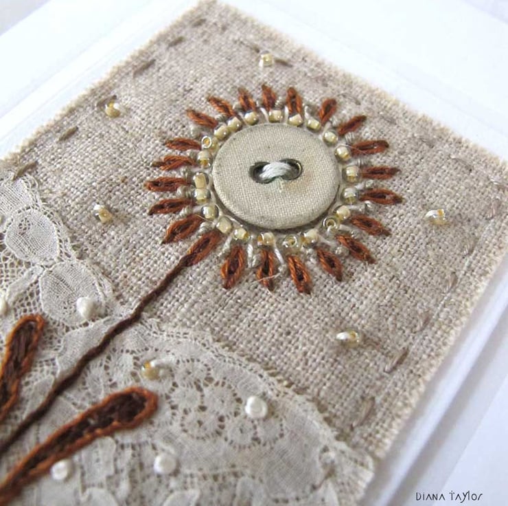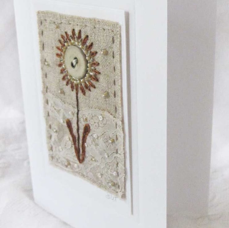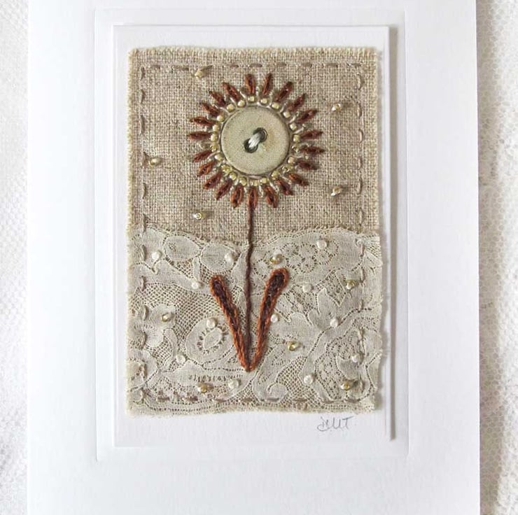 This beautiful card has been embroidered by hand onto a natural woven linen style fabric and hand made antique lace. The design is of a daisy style flower stitched around a vintage laundry button, and with added tiny glass beads - perfect for a special card, or perhaps framing it as it is. It has been stitched onto a card base and mounted on a good quality 300gsm card, and surrounded by a hand embossed frame. The card has been left blank for your own message.