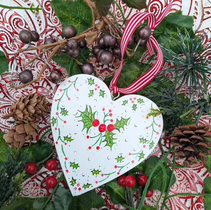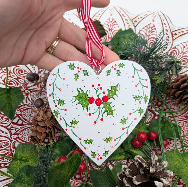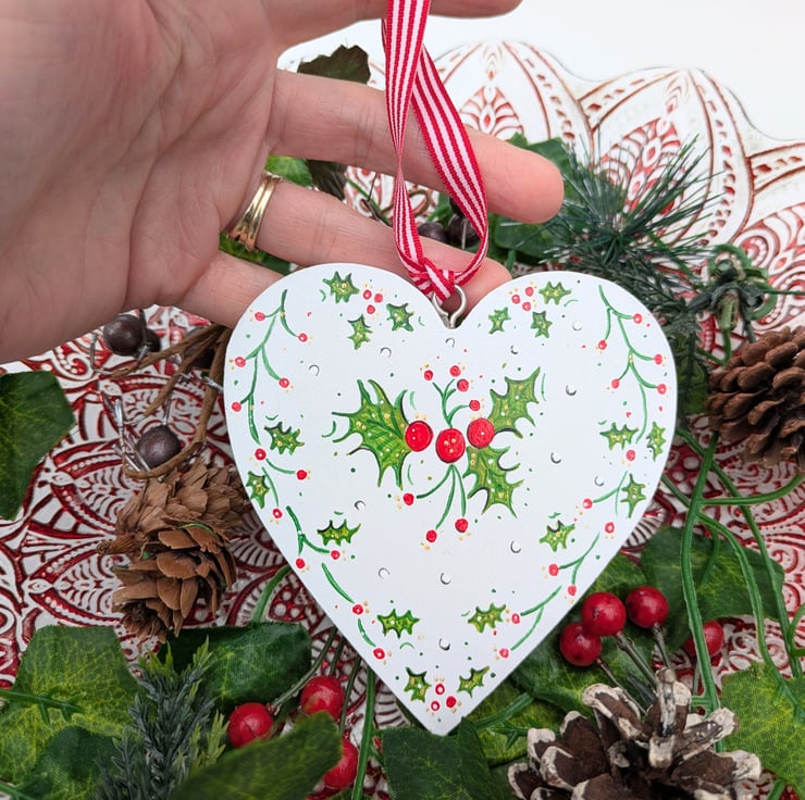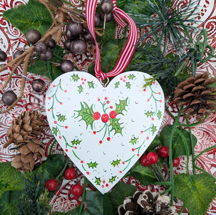 A beautiful hand-painted Holly Berry wooden heart Christmas decoration. This special heart would make a lovely Christmas gift or to decorate your tree at Christmas.