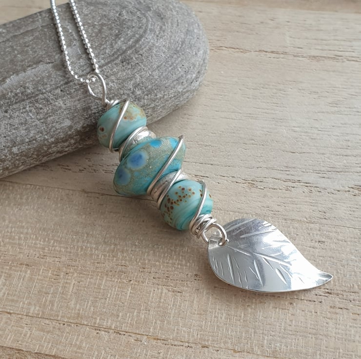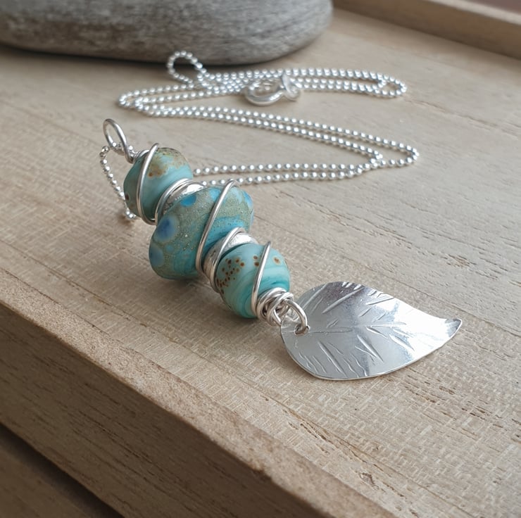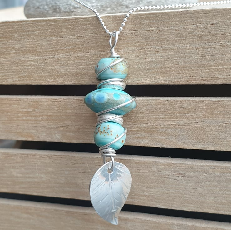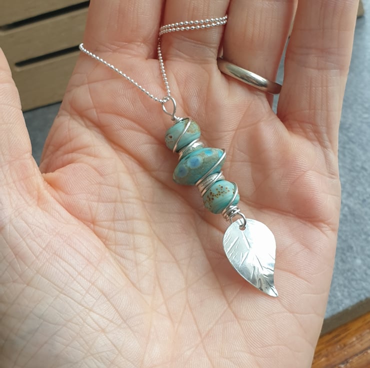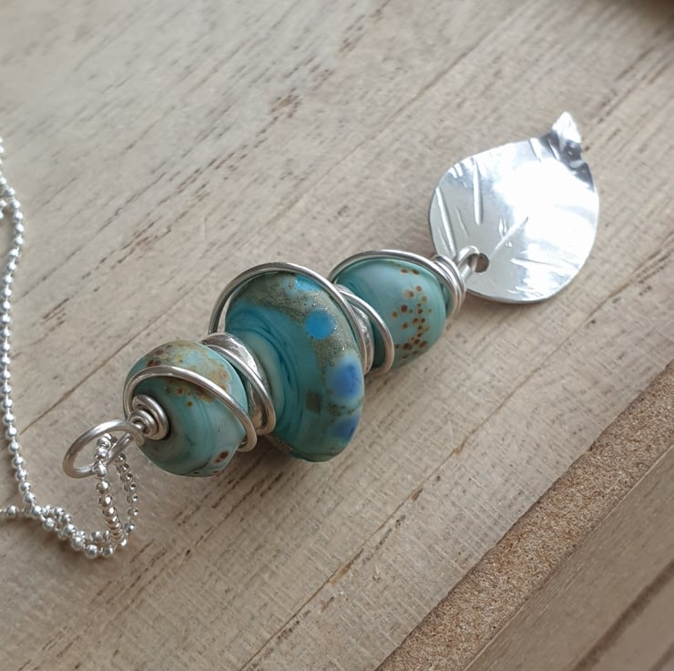 This unusual pendant is made from pale turquoise coloured lampwork glass beads, which I've paired with my own silverwork: a hammered leaf pendant hangs below the stack of lampwork and recycled silver nugget beads. I've wrapped the pendant stack with sterling wire and hung it from a silver ball chain in your choice of length.