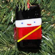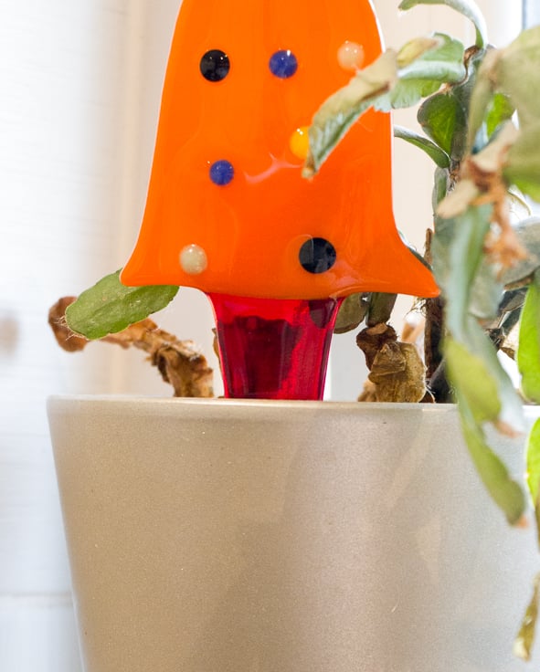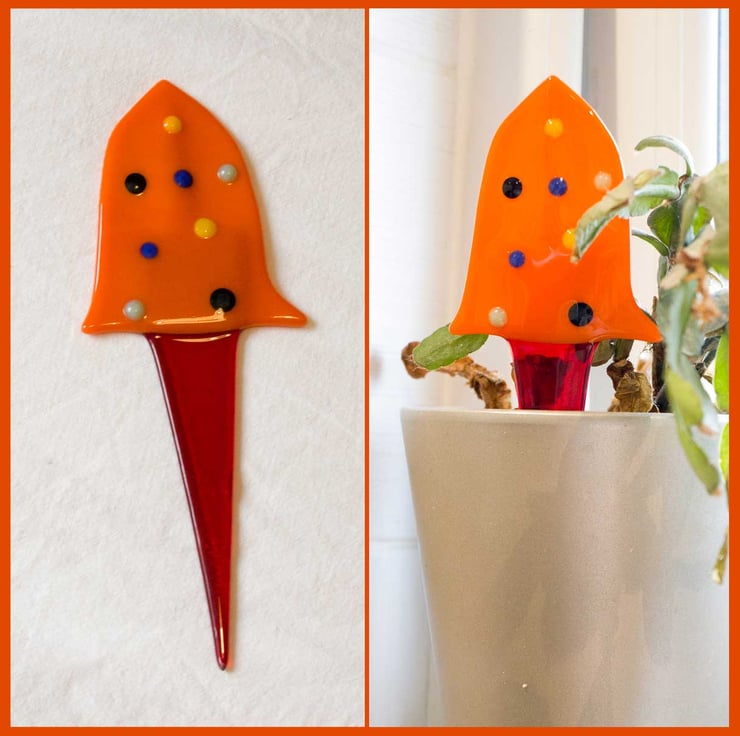 I hand-cut the orange cap from 3mm thick art glass and have laid this onto a stalk of red translucent glass. I've added coloured glass dots to give it even more character. It is approximately 21.5 cm tall.