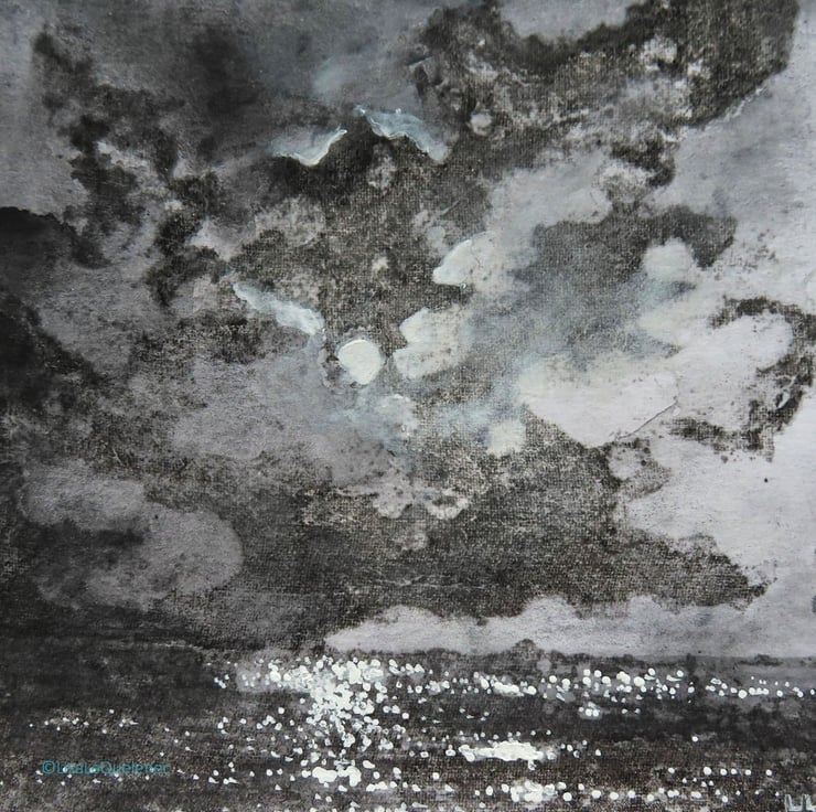 Smuggler's Moon, coastal scene in black and white mixed media.
