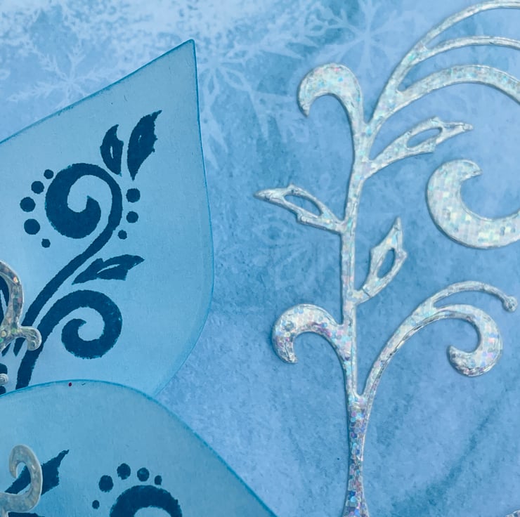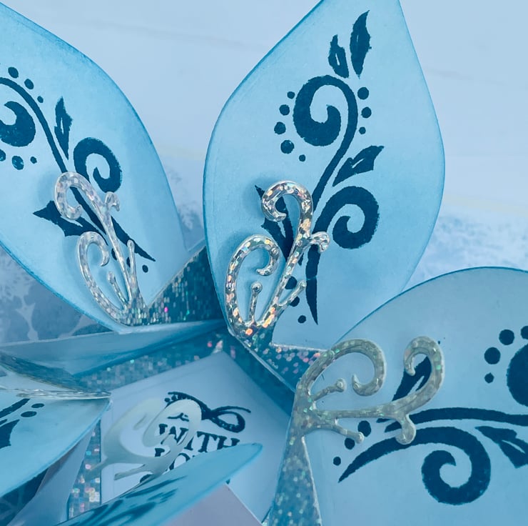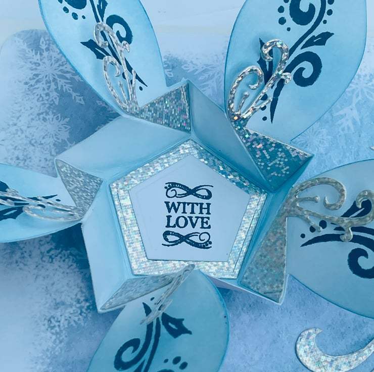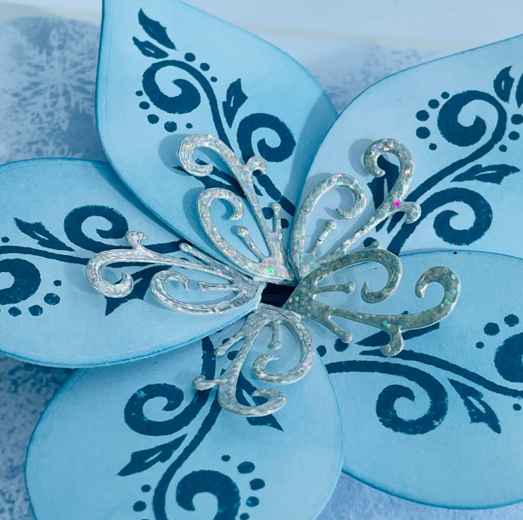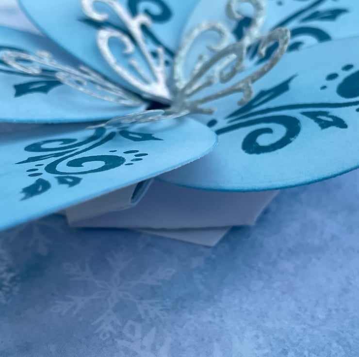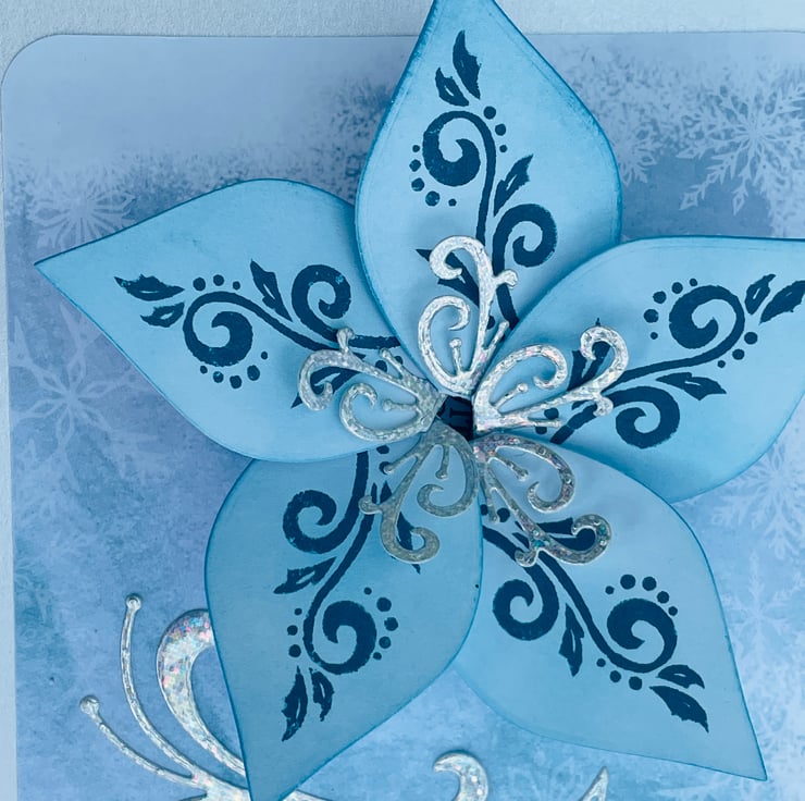 A truly luxurious Christmas card for someone special. This A5 card is truly unique. The background is a soft icy blue paper with scattered snowflakes. This makes the ideal background for the main feature - this is a kinetic opening and spinning poinsettia in complimentary ice blue and silver colours. The petals have blue swirls and holly stamped in matching ink. The fancy stamens are in silver holographic card. The whole flower spins when you twirl the flower. If you gently pull opposite petals the flower opens to reveal the greeting With Love. The flower closes with the opposite action. The card is finished with a large silver swirl and the greeting A very Merry Christmas to you. Stunning and totally unique.
