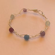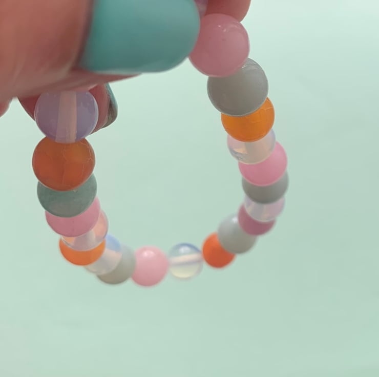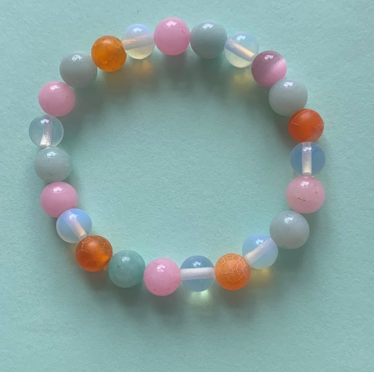 Pretty handcrafted gemstone bracelet consisting of genuine 8 mm moonstones, pink agate, amazonite and orange crackle quartz. It measures 7.5 inches (medium). Healing stones. Makes a lovely unique gift for that special person or why not treat yourself.