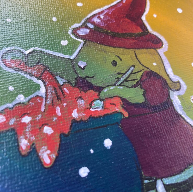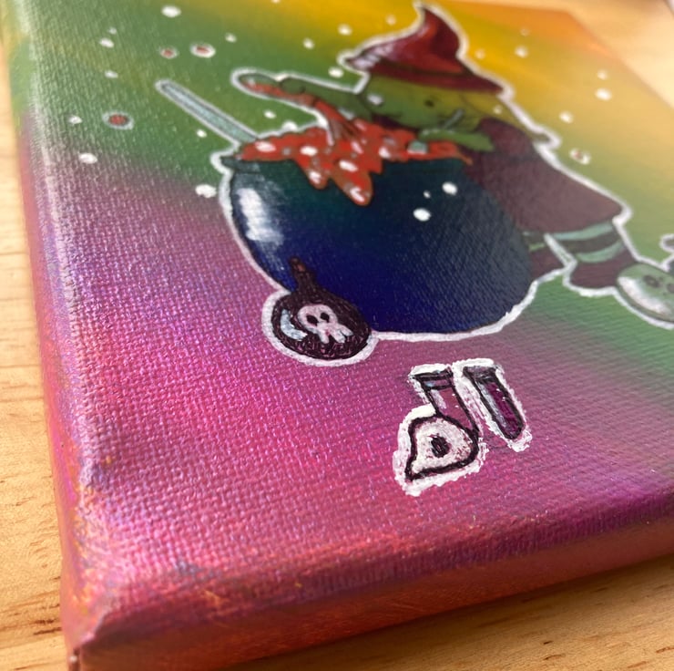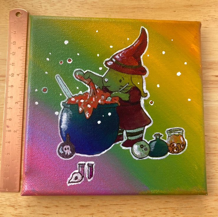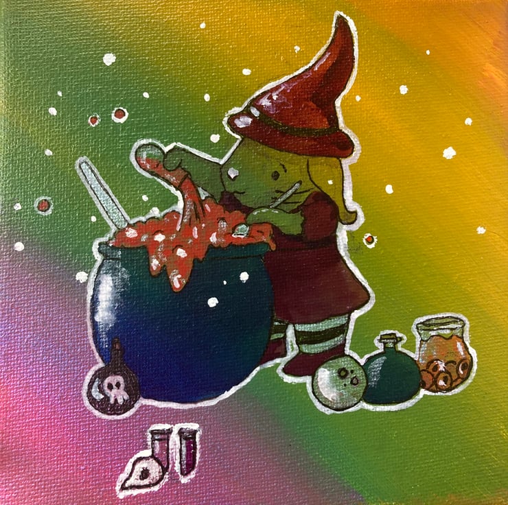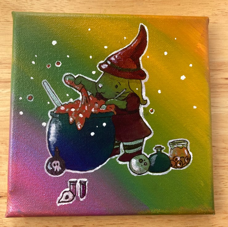 Potion Time is an illustration of a little bunny witch who is busy making a potion, it is going well but she hasn't noticed that it is starting to bubble over. A bright beautiful little canvas that would be perfect for spooky season or for anyone who is a little witchy fan all year long.