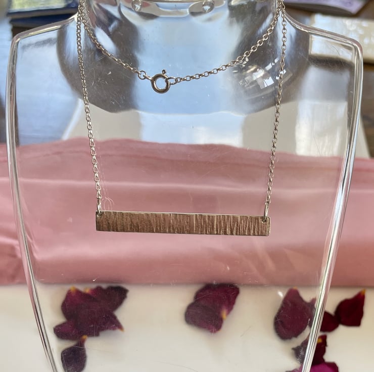 Silver bar pendant made by hand with 925 sterling silver. Bar measures 55cm by 8mm and is solid and hand cut and hammered. It hangs on an 18ins chain so should hang nicely on most necks. Message me if you can concerned about the length.
