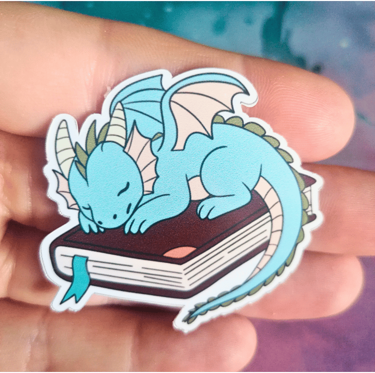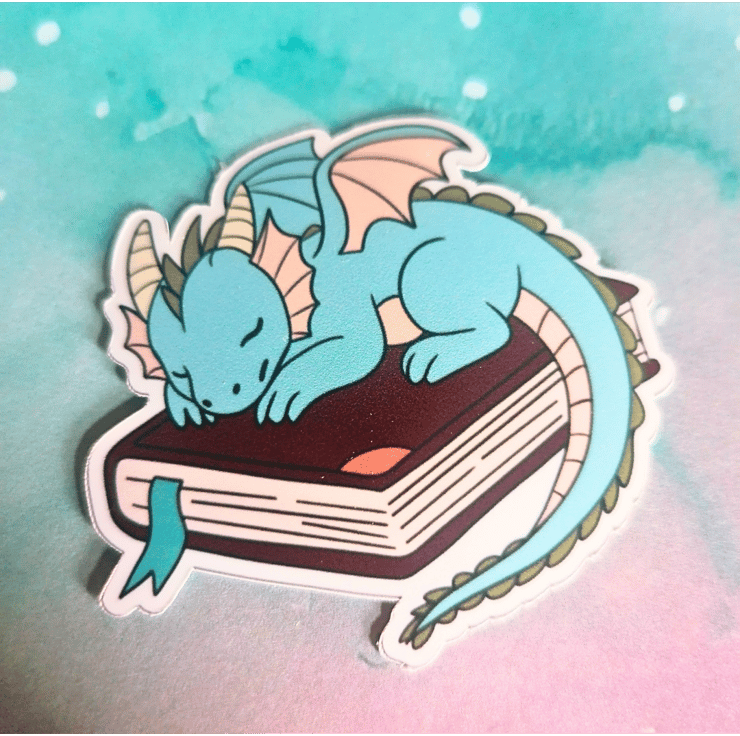 The Book Dragon glossy vinyl sticker. Made with quality vinyl sticker paper and a clear laminate for extra protection and durability. This sticker can be stuck on anything you like, including laptops, Kindles, books, and windows - anything! Suitable for indoor and outdoor use.