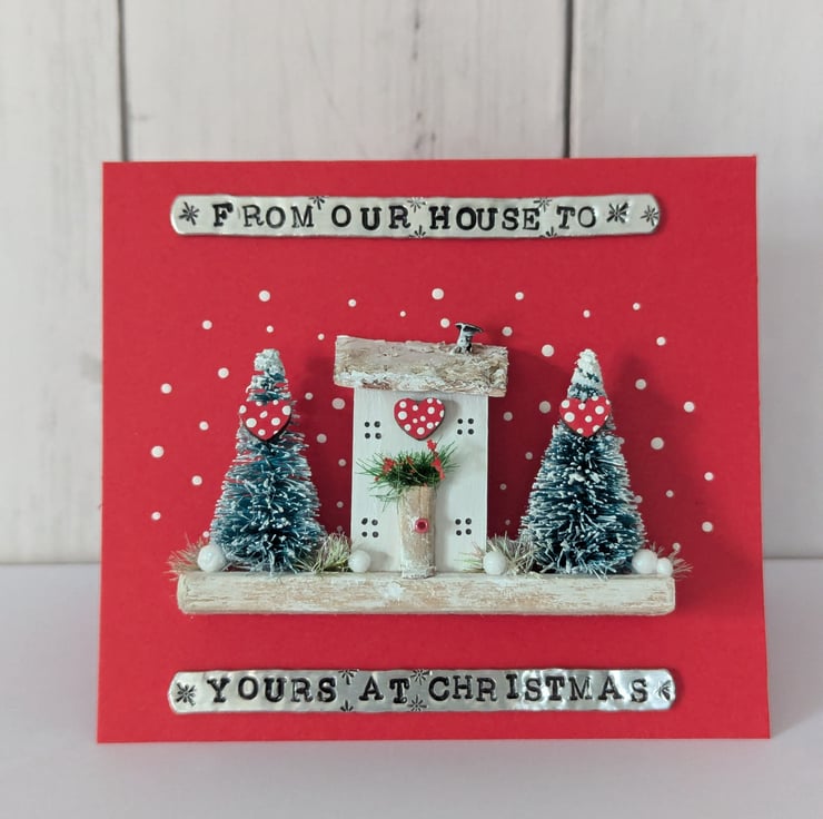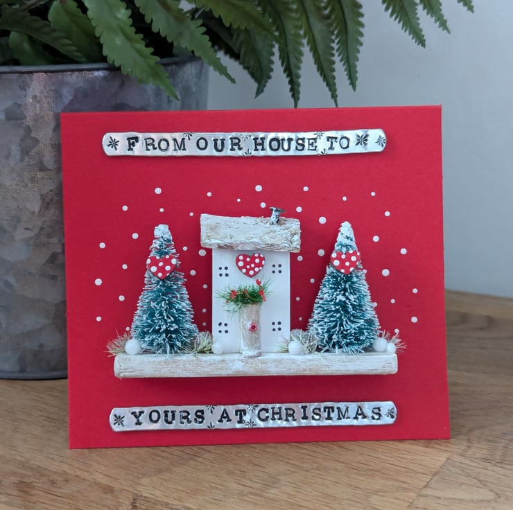 This card has a hand hammered 'From Our House To Yours At Christmas' message on the front which is hand hammered by me.