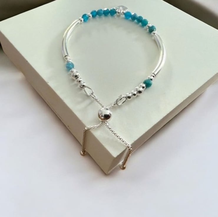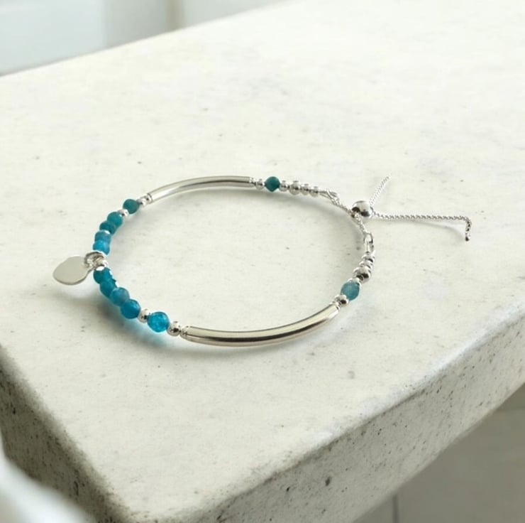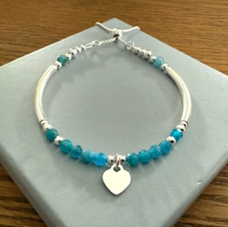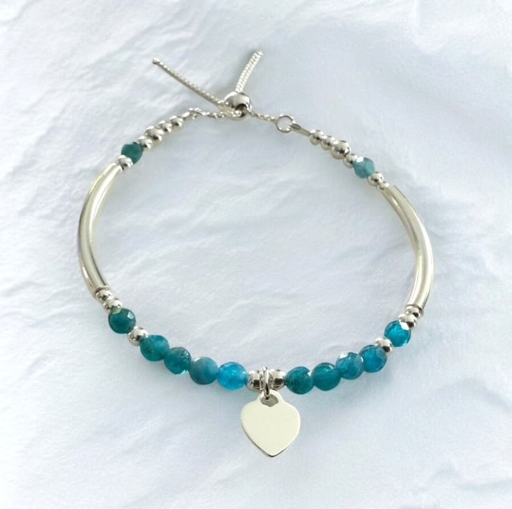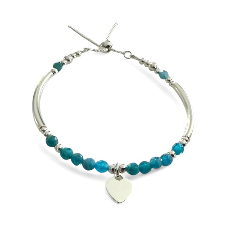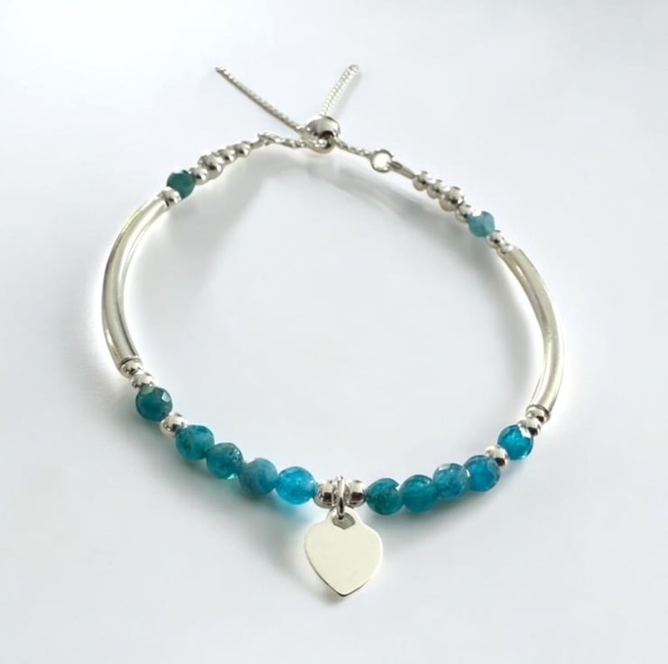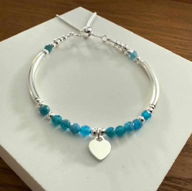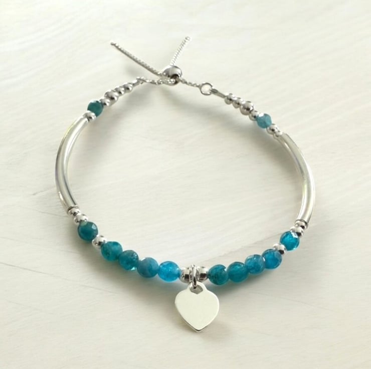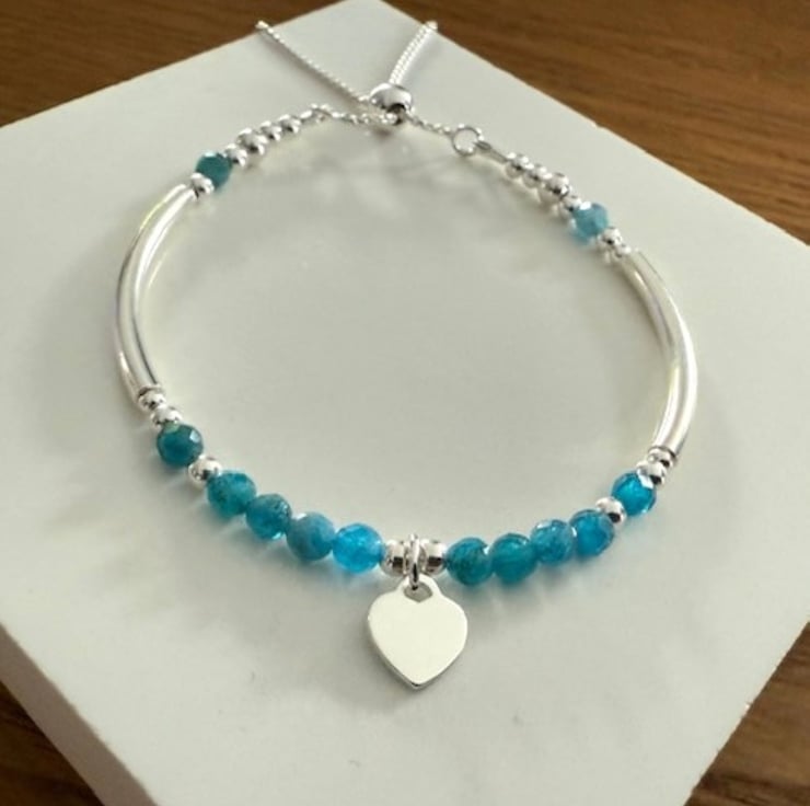 Handmade blue neon apatite bracelet is handmade with sparkling 4mm faceted gemstones and finished with a sleek sterling silver noodle design. A sterling silver heart charm adds a touch of love and meaning.