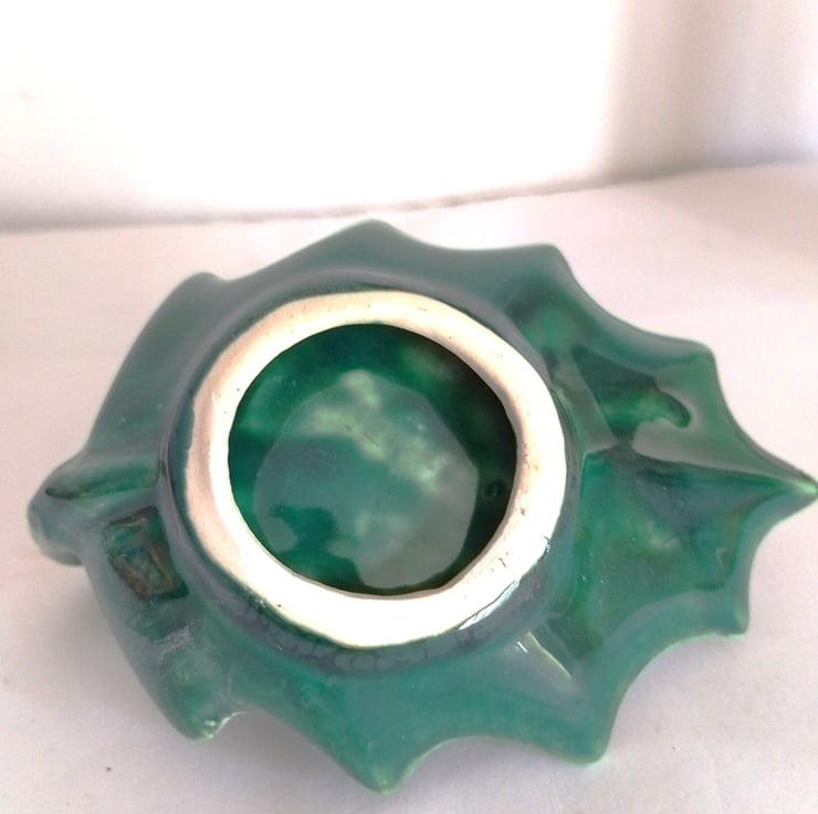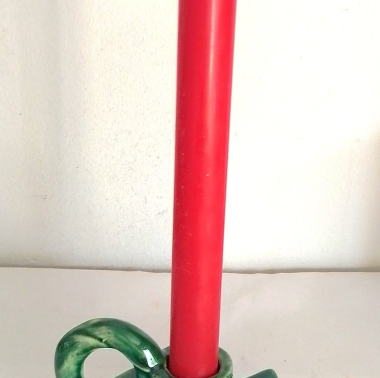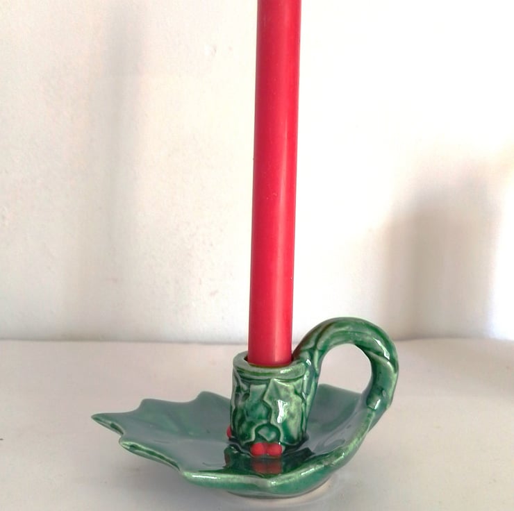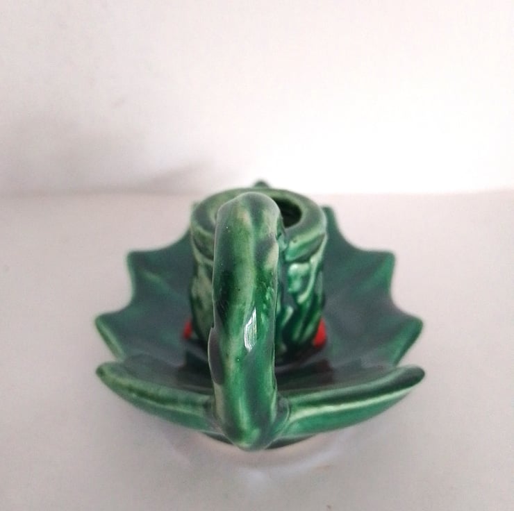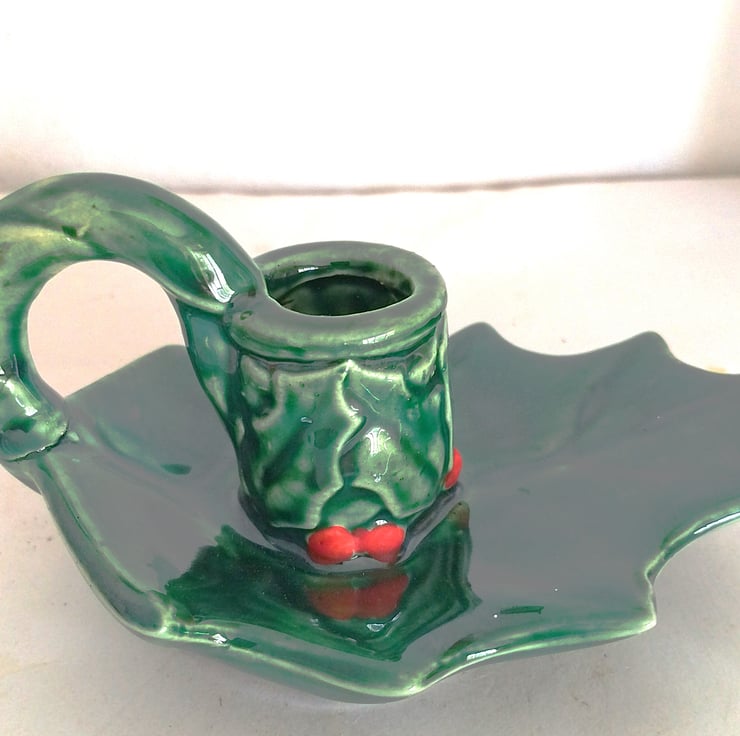 Cast from a rare mold here at Penarth Ceramics. Now a vintage mold of a Holly themed candleholder suitable for all tall and tapered candles. The candle well is surrounded by holly leaves in relief, with Holly berries in red decorating the bottom of the candle well and the dish is shaped like a Holly leaf with veins with a textured handle. It Has been finished in a glossy forest green glaze.