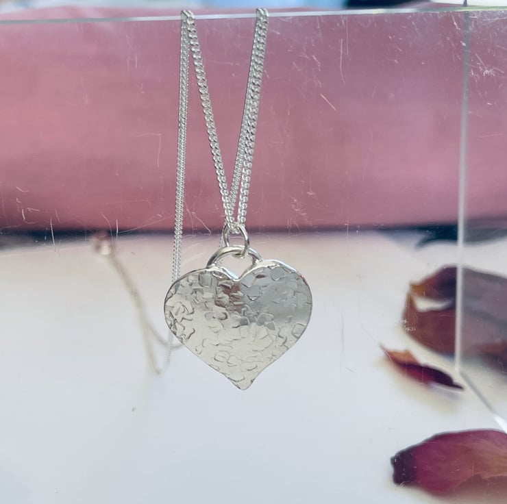 Absolutely unique hammered and shaped 925 sterling silver heart on an 18 ins diamond cut curb chain. I made this by cutting a heart shape, doming it to give a pillow effect, and hammering it with a cross shaped hammer. I then soldered on a bail and jump ring. The heart measures 2cm wide. I only have one of these.