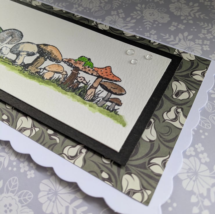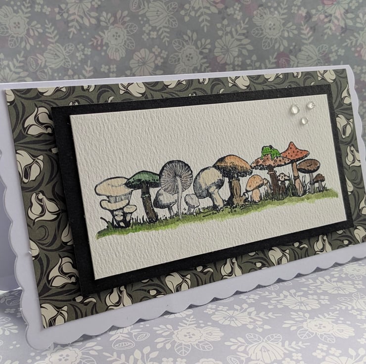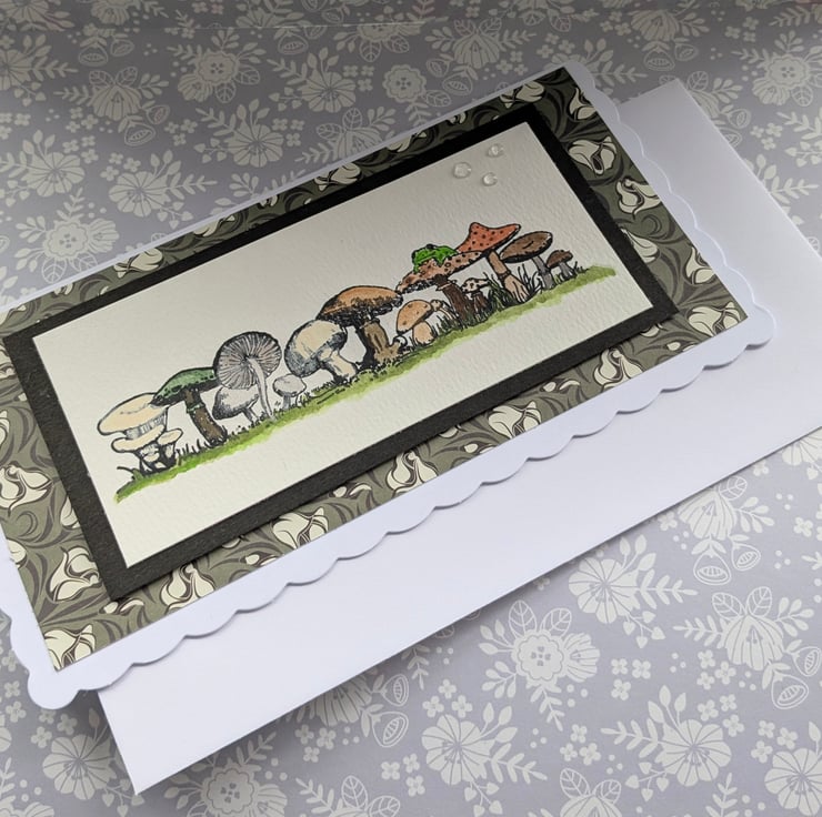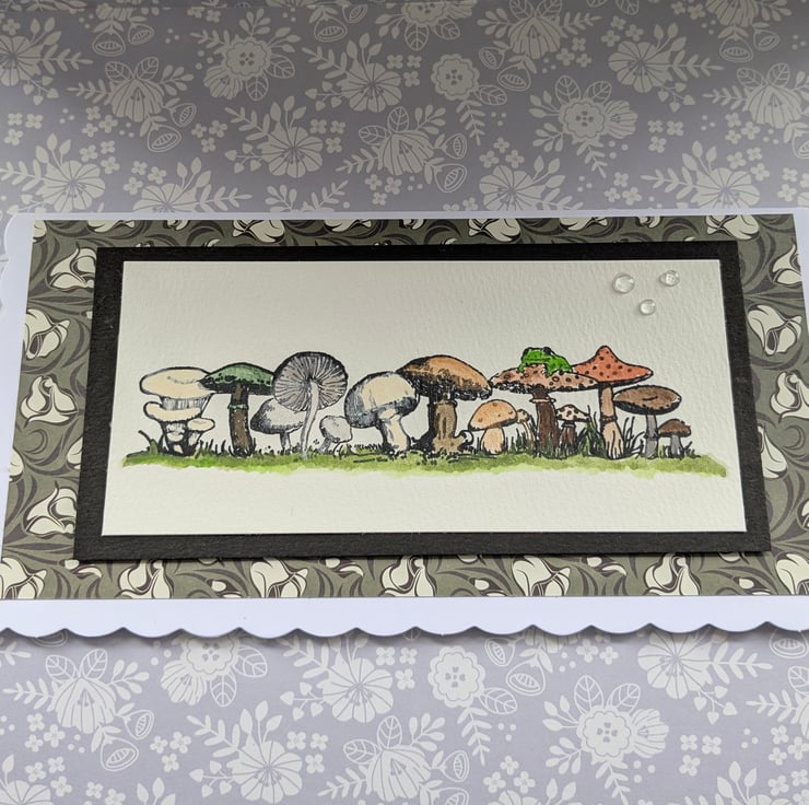 The front panel of the birthday card features a sturdy watercolour card with a hand printed image of fungi growing in the grass. These have been hand-painted in natural earthy colours to brighten anybody's special birthday suitable for either male or female, young or old....