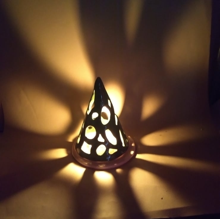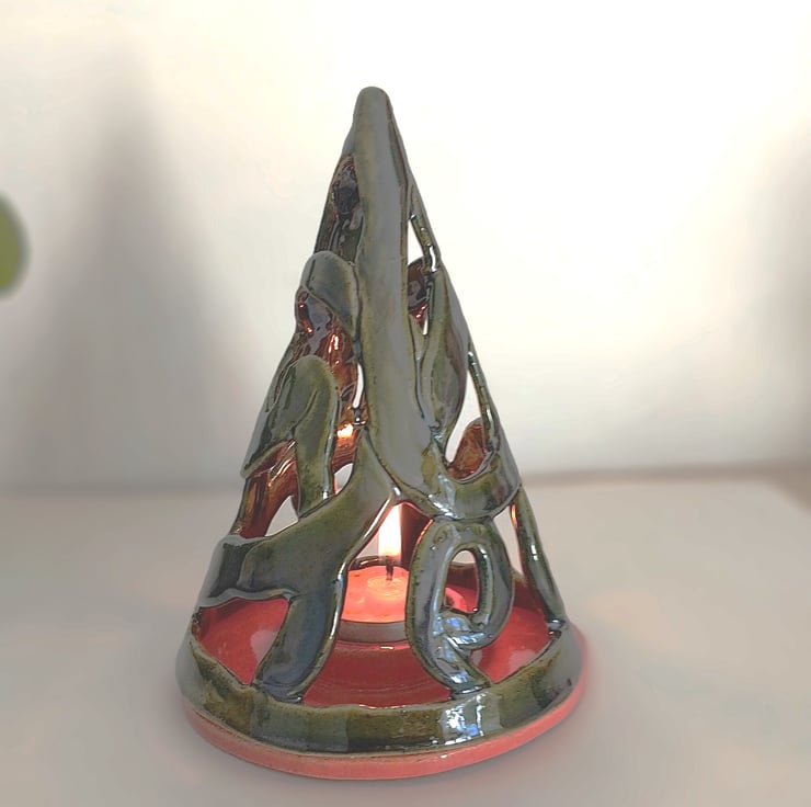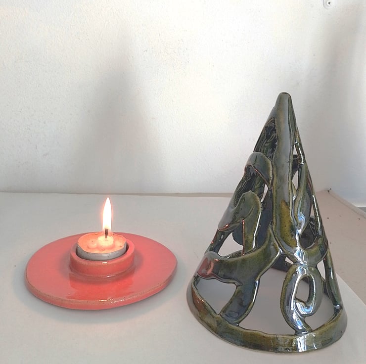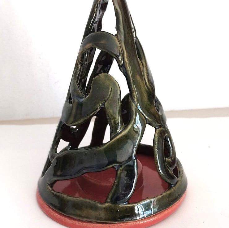 Made by hand in a conical mold from random strips, to make this very modern abstract style Christmas decoration as well as being a tealight holder. Casts wonderful shadows on dark Winter evenings, when lit up in a darkened room. Comes in 2 parts where the top is placed over the base with the candle well inside. Does get hot so do not use near unsupervised children. Finished in a glossy forest green color with the base with the candle well being fully coated in red. Stands 17.5 cms tall x 12 cms diameter base.