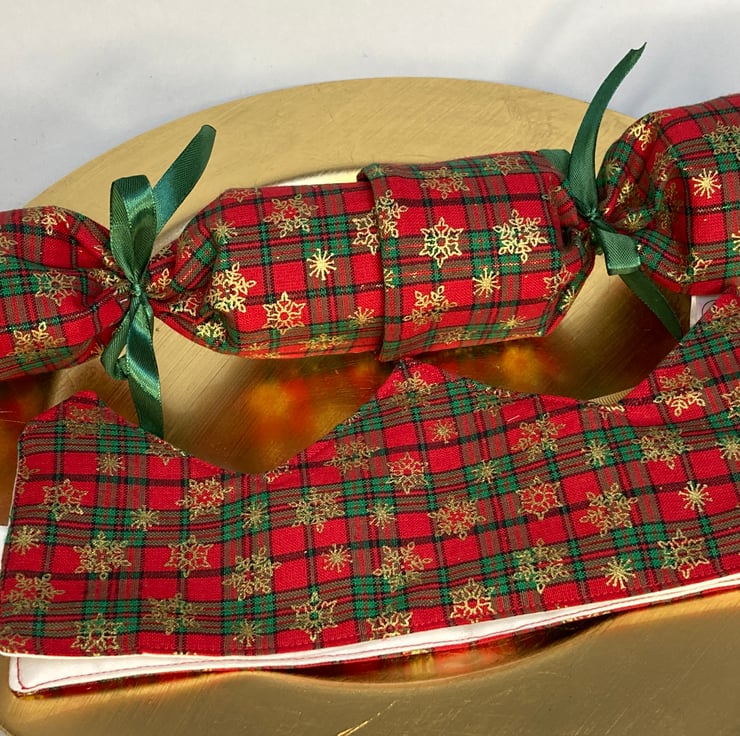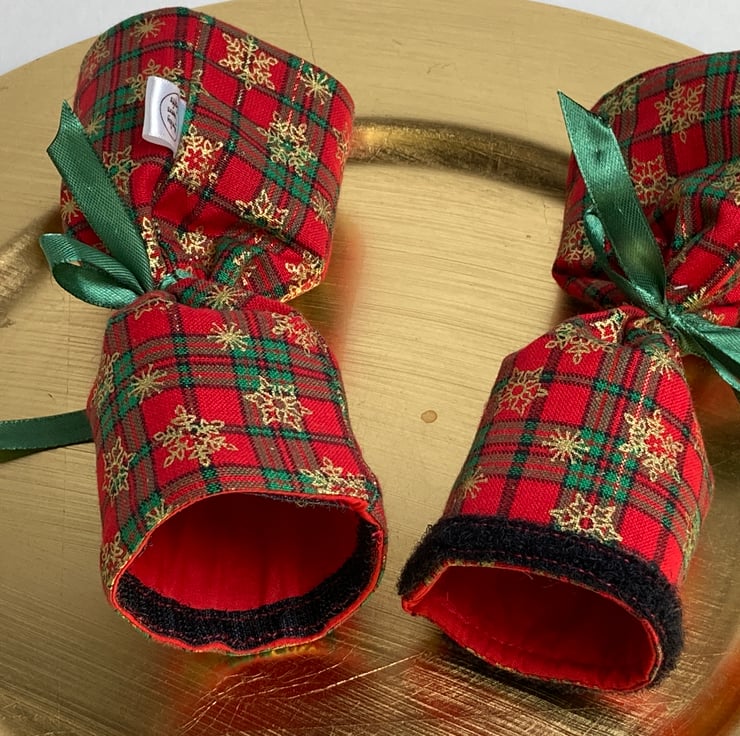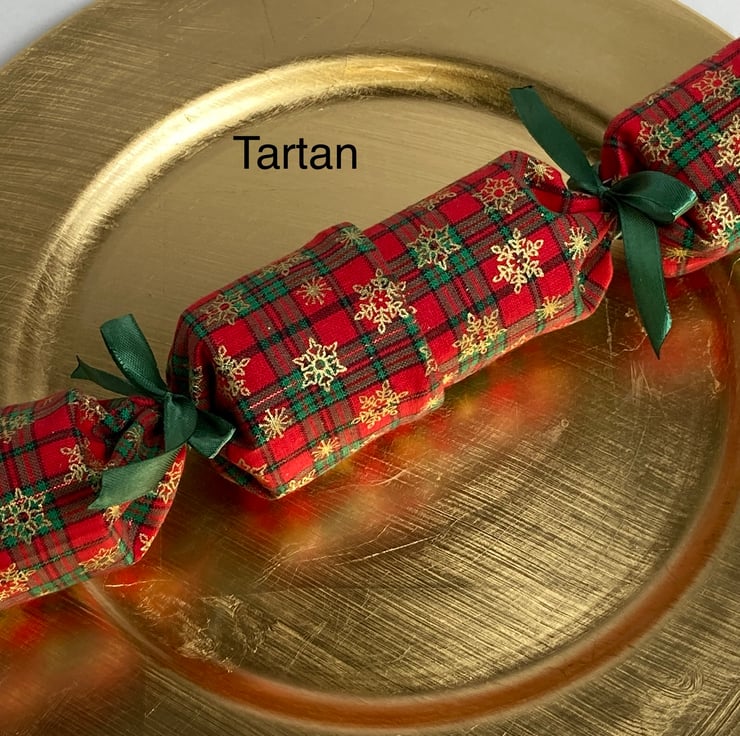 These crackers are made from a lovely red and green tartan, decorated with gold snowflakes. They are lined with white polycotton and fasten with ribbons. The colour of ribbons may vary.