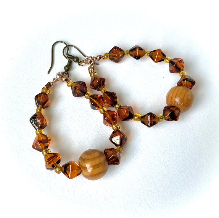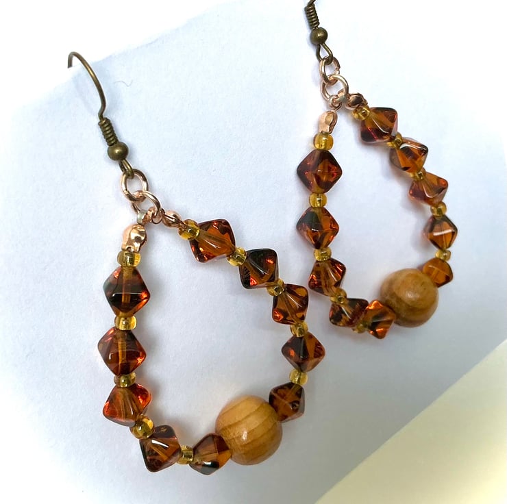 A lovely Autumn look for those days when attracting attention is on the agenda. With diamond shaped Amber glass beads which catch the light giving off a warm amber glow.