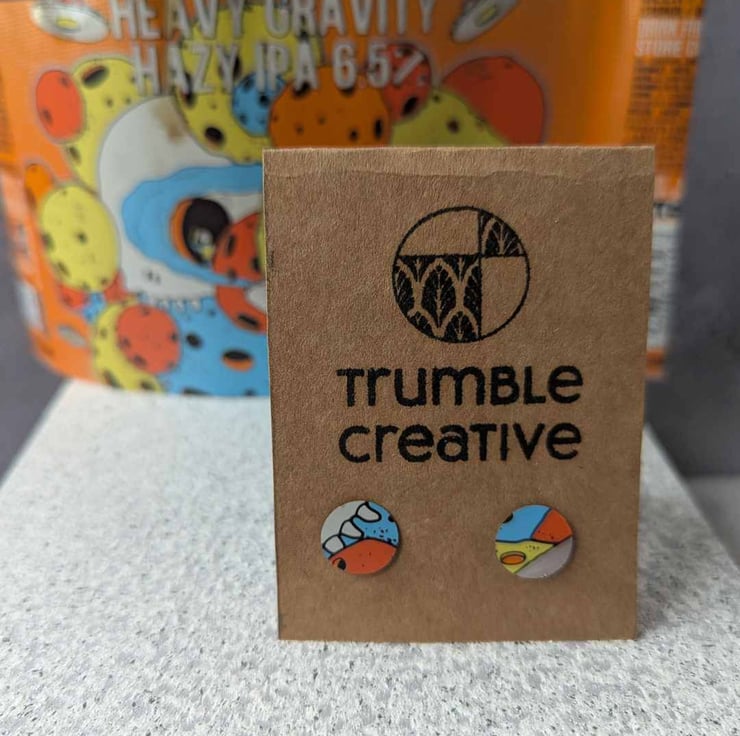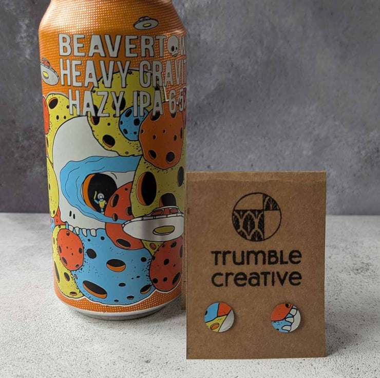 Discover the art of transformation with these unique upcycled beer can stud earrings, turning everyday waste into wearable art! Handcrafted with love and creativity, these earrings are made from carefully selected, colourful beer cans beavertown craft beer, meticulously cut and shaped into stunning stud designs. Each pair boasts a one-of-a-kind pattern, ensuring your earrings are as unique as you are.