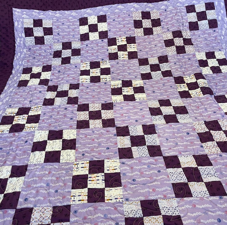 Let your dreams drift through fields of lavender with this lovingly handmade 9-patch quilt, stitched in soothing shades of lilac and deep purple. Each square is a quiet note in a lullaby of color, pieced together with care to bring warmth and serenity to your space.