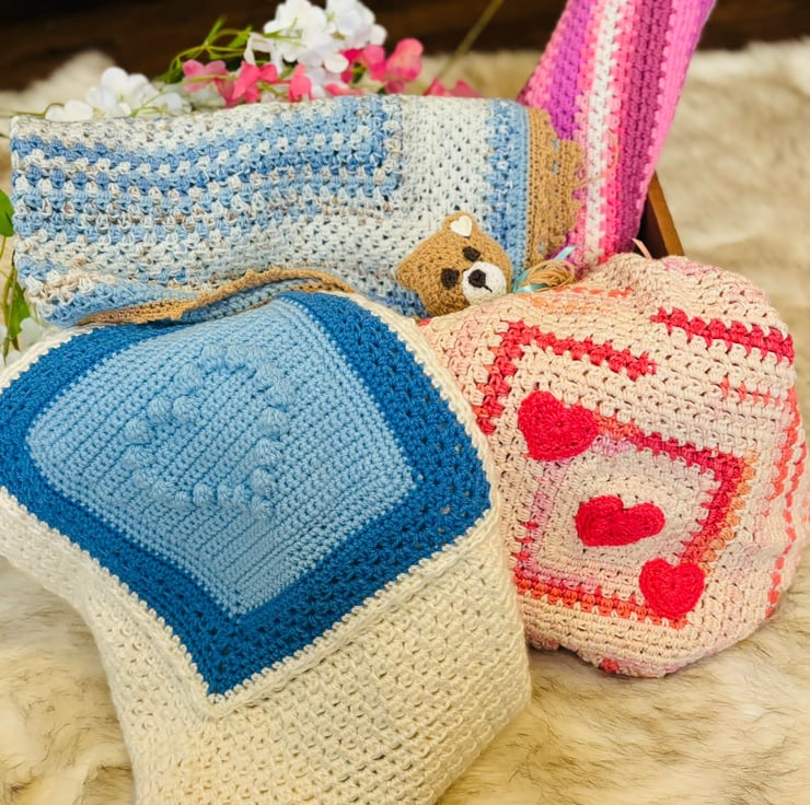 From cuddly baby blankets, baby cardigans to stylish bags and trendy hexagon jackets, I offer a delightful range of keychains and jewellery too!