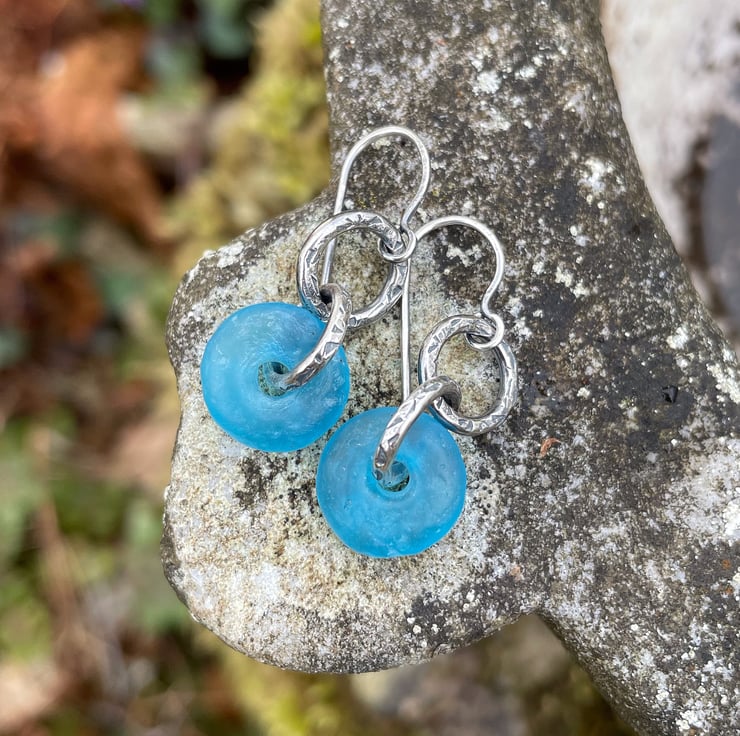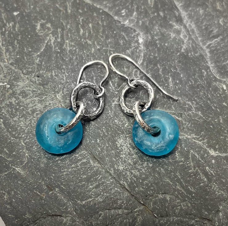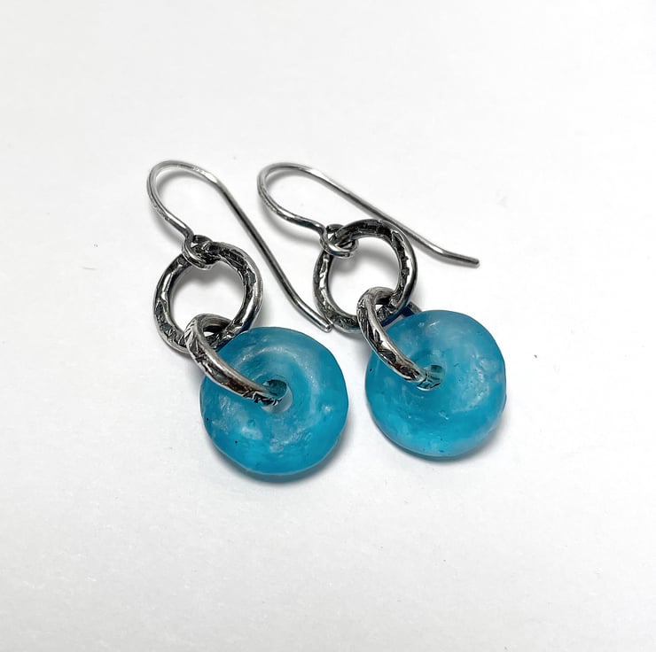 Recycled African turquoise blue glass donut beads and heavily textured oxidised silver rings have been combined to make these rustic little drop earrings.