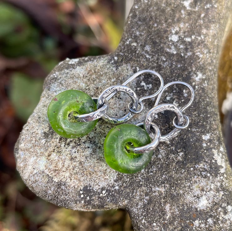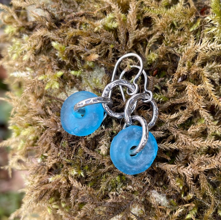 The handmade glass beads are a lovely vibrant blue , they have a matte organic finish. The glass donuts hang below silver rings that I have textured with hammers and punches, to get an ancient weathered look. I have oxidised them dark in the recesses to accentuate the design.