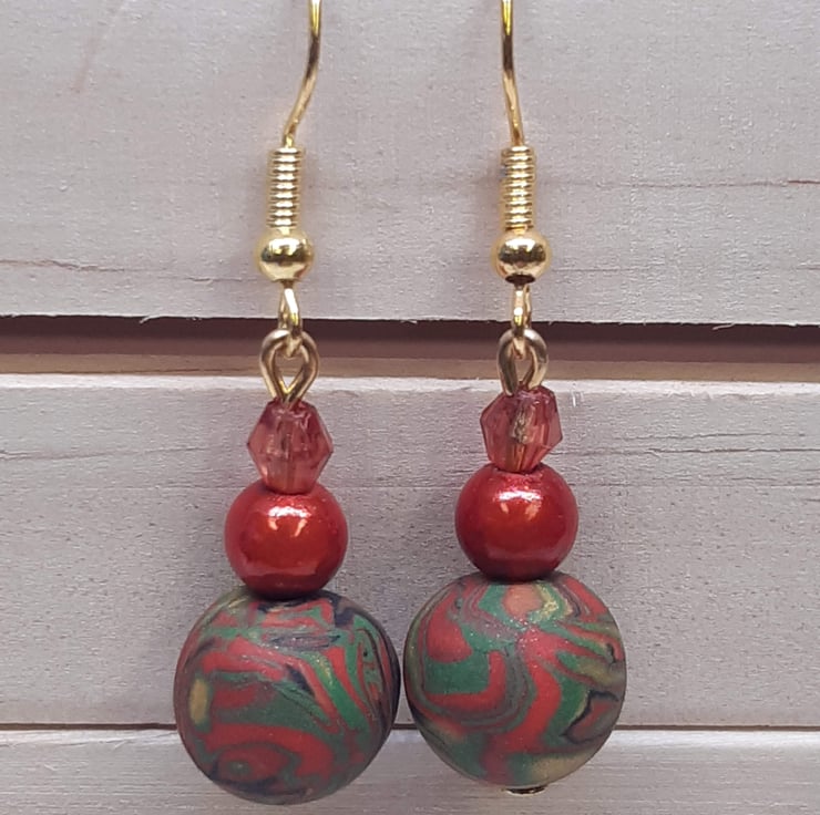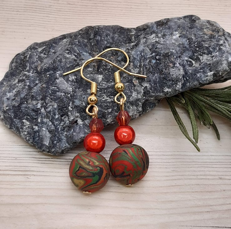 Dangly earrings in green, red, black and gold polymer clay blended together in a unique swirl design.
