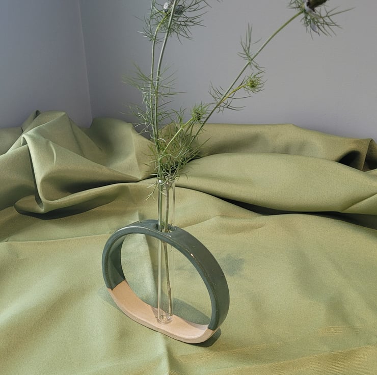 This wheel thrown and altered stem vase has a green glaze on its outer surface. It comes with a glass test tube for your stems. This piece has a width of 13.5cm and a height of 10.5cm.