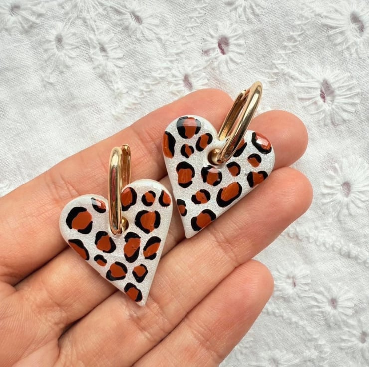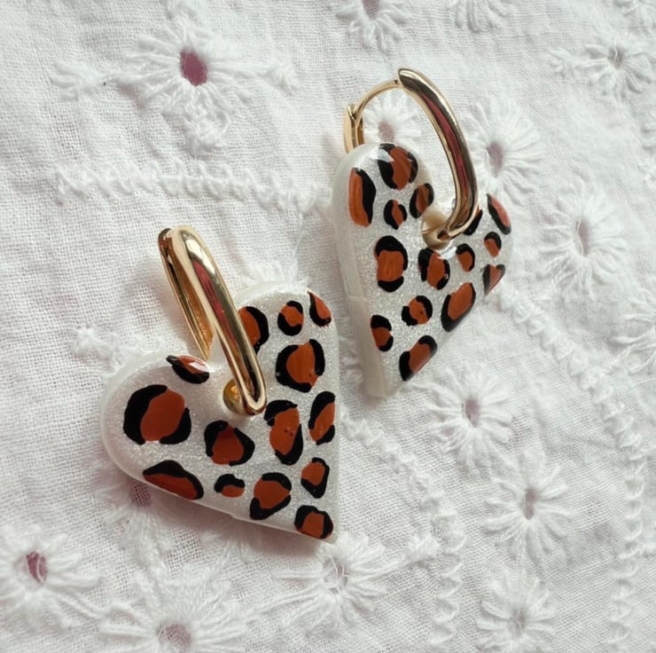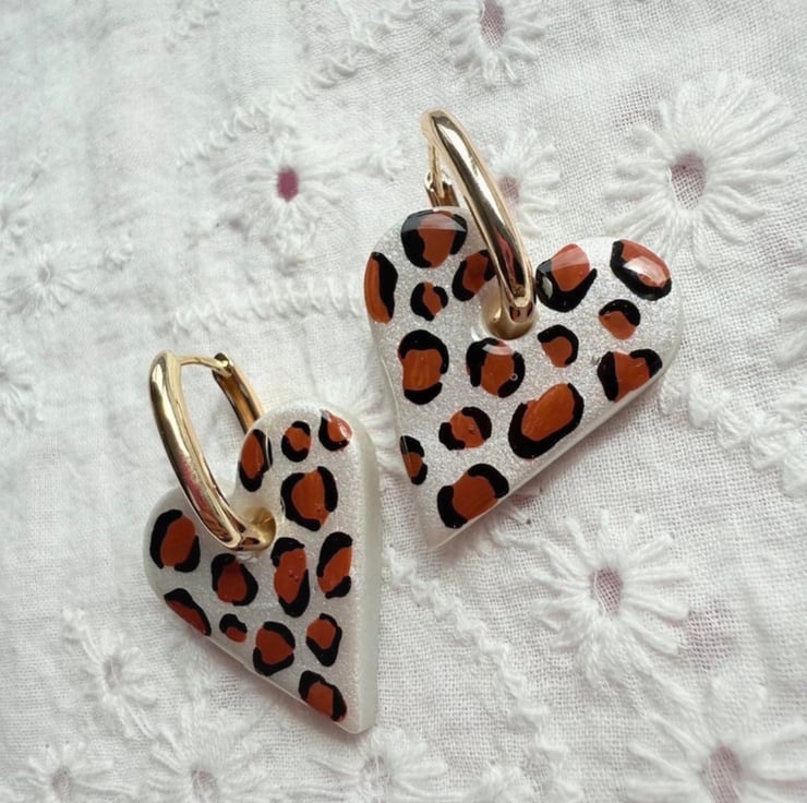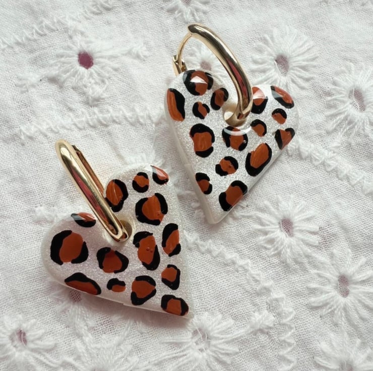 These heart-shaped earrings are hand-painted with a bold leopard print design. Finished with 18K gold plated hoops, they are lightweight, comfortable, and perfect for everyday wear or adding a playful touch to any outfit.