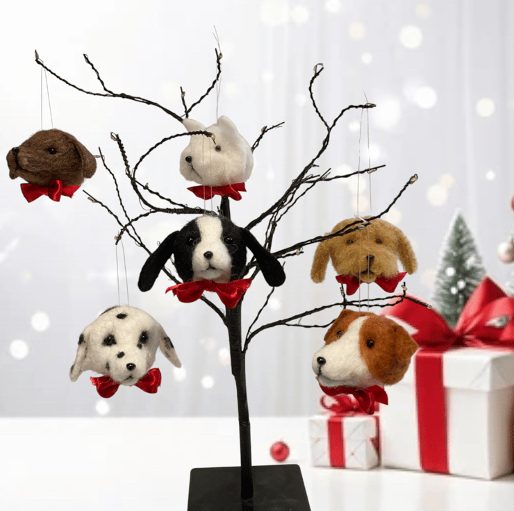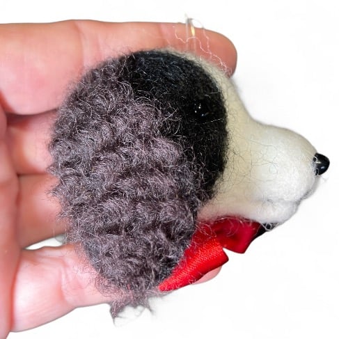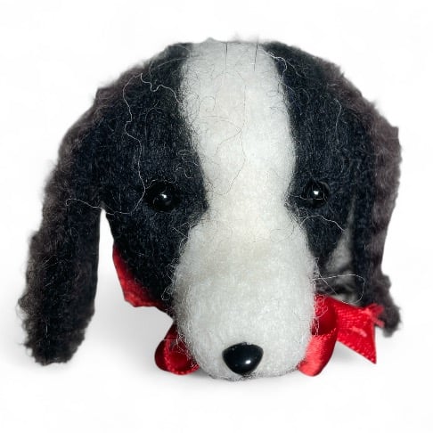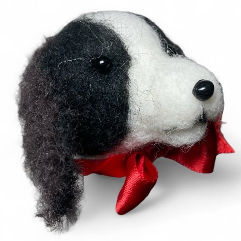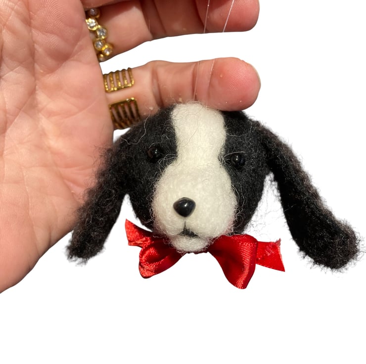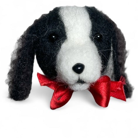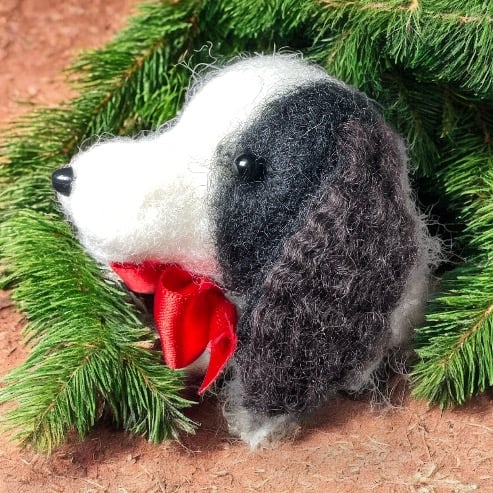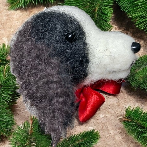 A springer spaniel dog bauble ready to hang from your tree this christmas. The bauble is formed using woollen fibres needle felted and sculpted into shape using a barbed felting needle. The springer spaniel has textured felt ears, a black plastic nose and glass eyes. A red ribbon has been added at his neck and a clear nylon thread has been added to enable the dog to be hung easily from the tree.