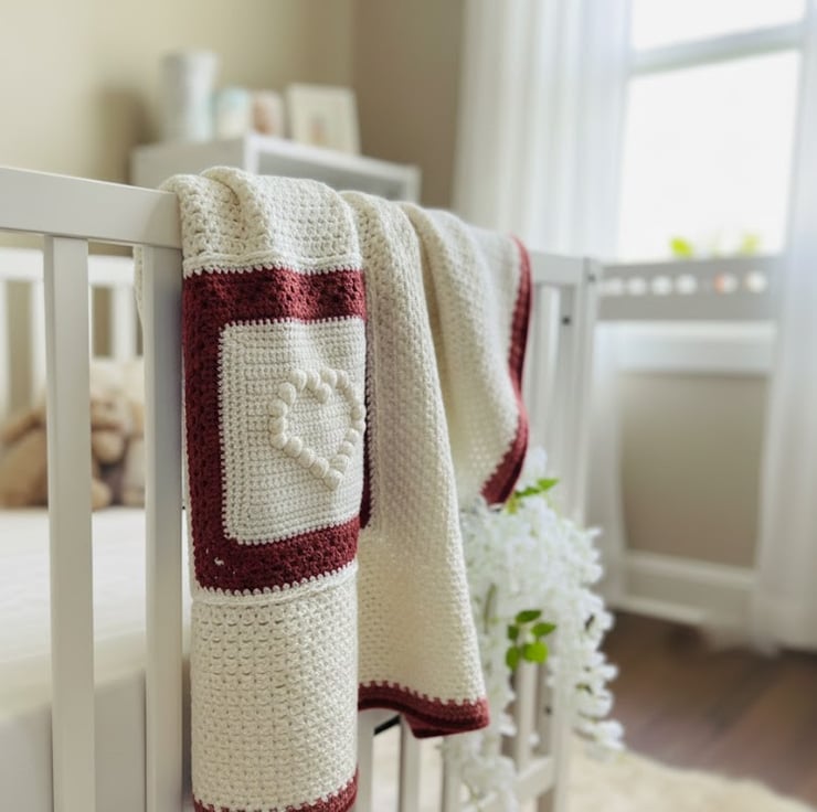 Whether you are looking for a standout baby shower gift or a future family heirloom, this heart-motif blanket conveys care in every stitch. It is perfectly sized for use in strollers, car seats, or for quiet moments in the nursery.