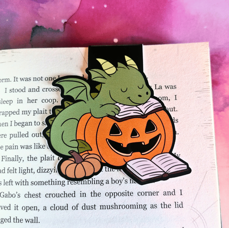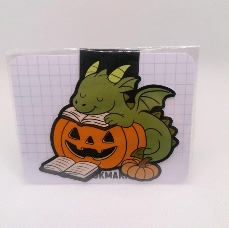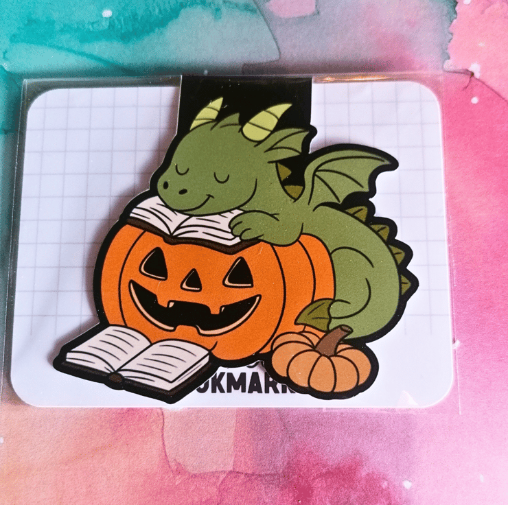 The Book Dragon - Autumn Edition in the form of a glossy magnetic bookmark!. Printed on glossy photo paper and laminated for additional protection. Weatherproof, tear-resistant and durable. Featuring the same design on the front and back, allowing you to flip the orientation of the design.