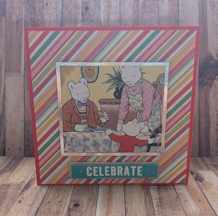 This delightful colourful birthday card features a recycled image from a Rupert annual.