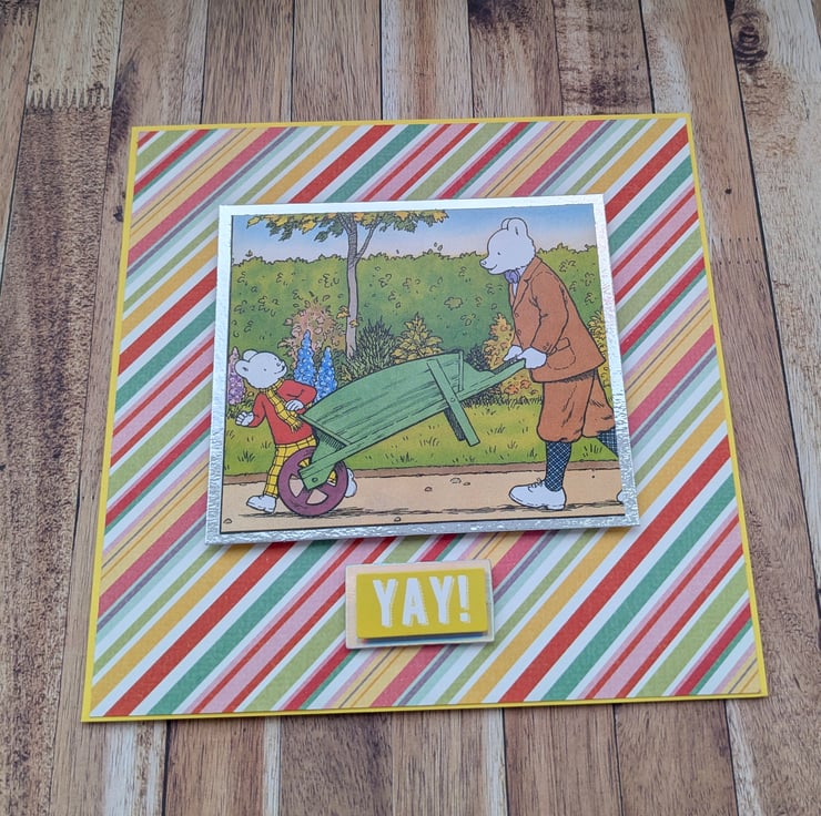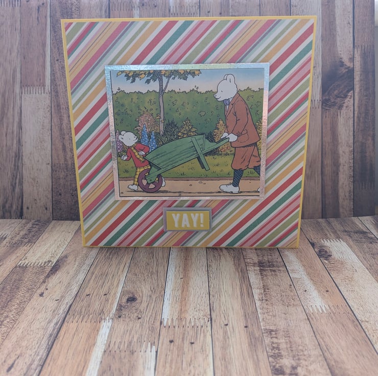 This delightful colourful birthday card features a recycled image from a Rupert annual.
