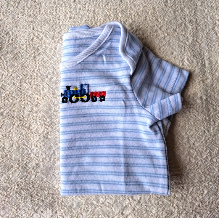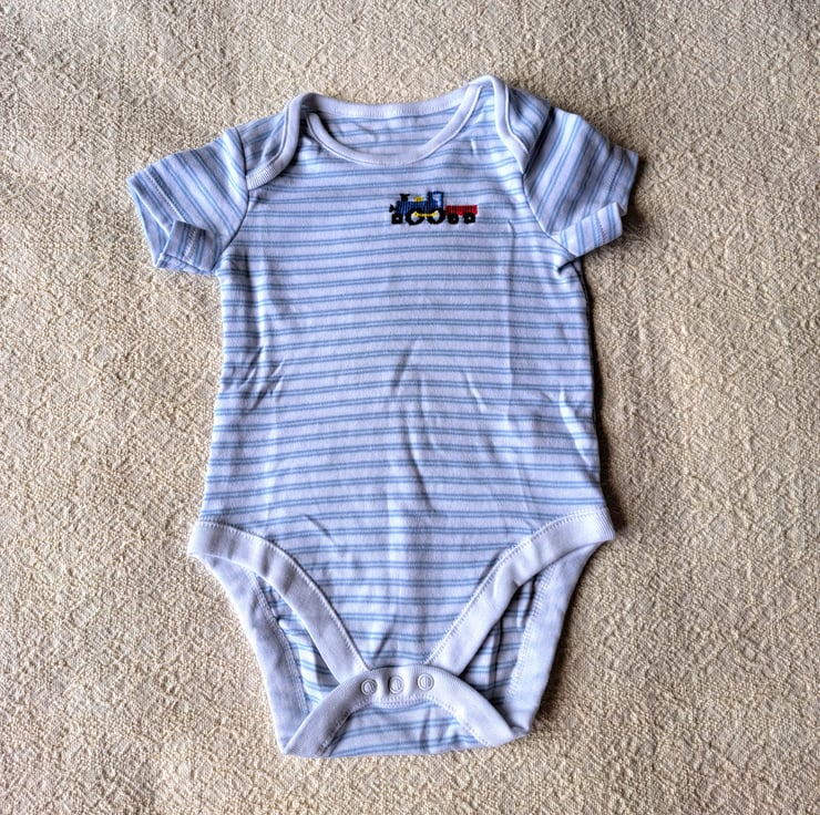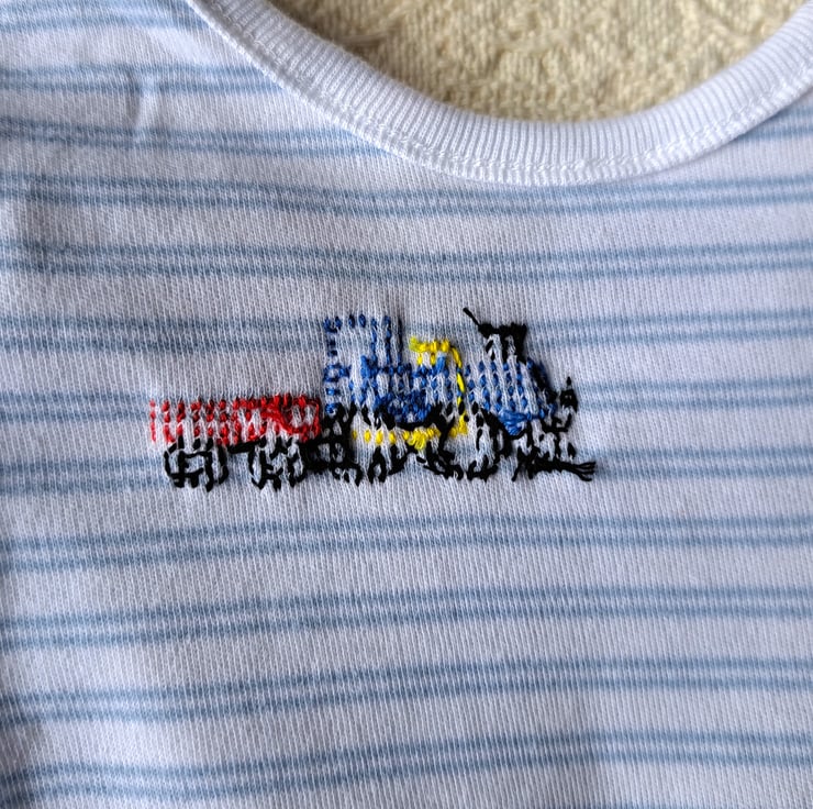 I have hand embroidered a royal blue toy engine pulling a red truck on the left front of this baby vest. The vest is white with pairs of light blue stripes, two of which I have used as tracks for the train. As I never use a permanent backing material when hand stitching kids' clothing, there is nothing inside this garment to irritate your child's skin. The vest has an envelope neck, short sleeves and three press studs between the leg openings. It is all cotton and can be machine washed.