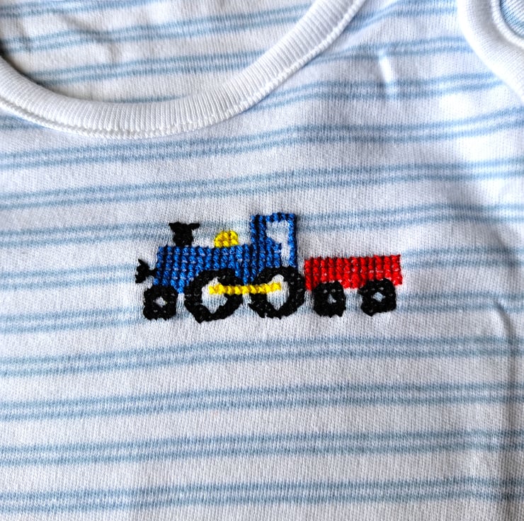 I designed this little motif many years ago in order to avoid any copyright issues over a certain beloved tank engine and his friends! I enjoy stitching it and it has proved popular.