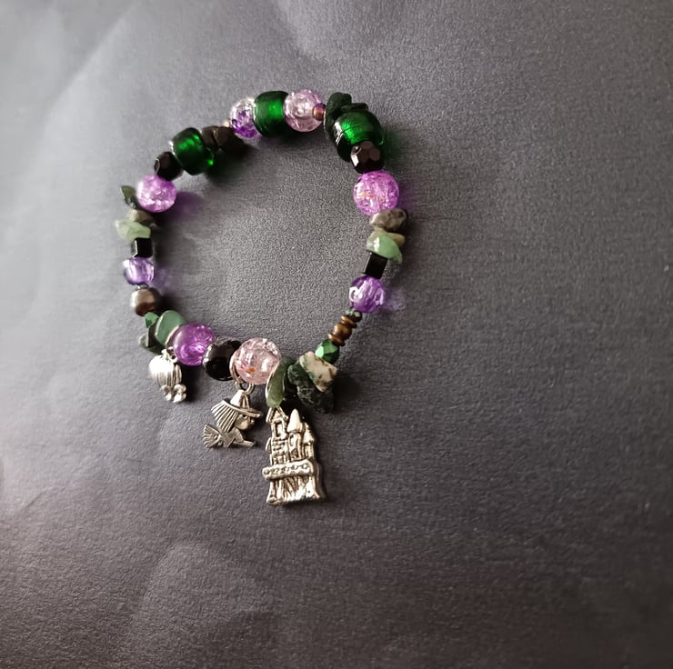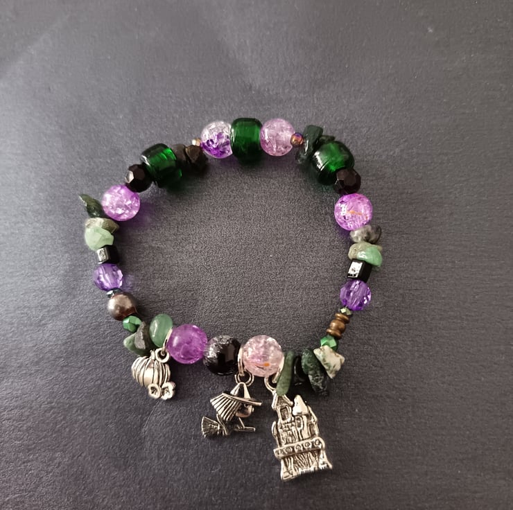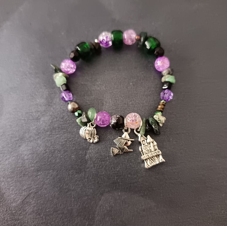 This handmade bracelet is crafted with an assortment of different sized beads in the colours of purple, green and black, with some pieces of moss agate crystal chip. This piece measures approximately 7 inches and features three charms: a small pumpkin, a witch on a broomstick and a haunted house. Alternative, gothic, spooky cute style.