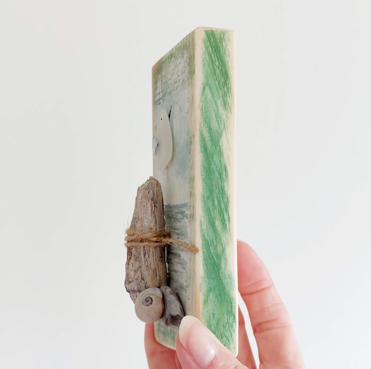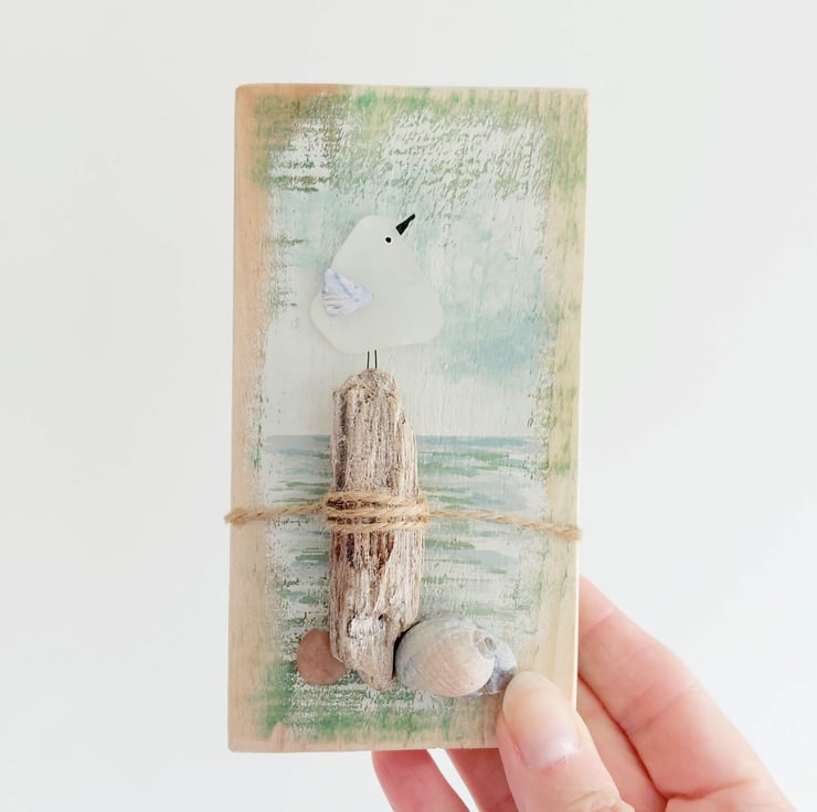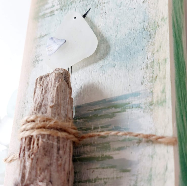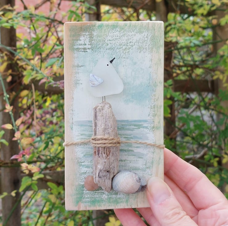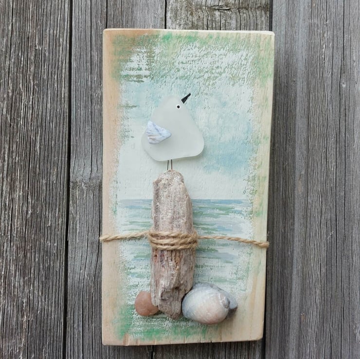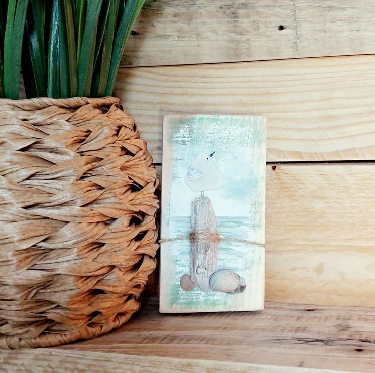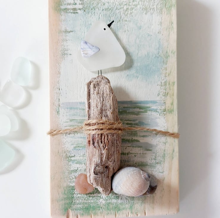 Bring the beauty of the coast into your home with this sea glass seagull wall art. Set onto hand painted reclaimed wood and embellished with beach finds, this quirky home decor is utterly adorable. The gull is crafted from hand painted sea glass, and he is perched on a post made from a piece of driftwood. Tiny pebbles and shells are fixed underneath to complete the beachy scene. The background is crafted from a piece of reclaimed pallet wood, painted and sanded before being beautifully hand painted with Farrow and Ball pastel tones. This is a one off piece and the item you receive will be as shown in the product photographs.